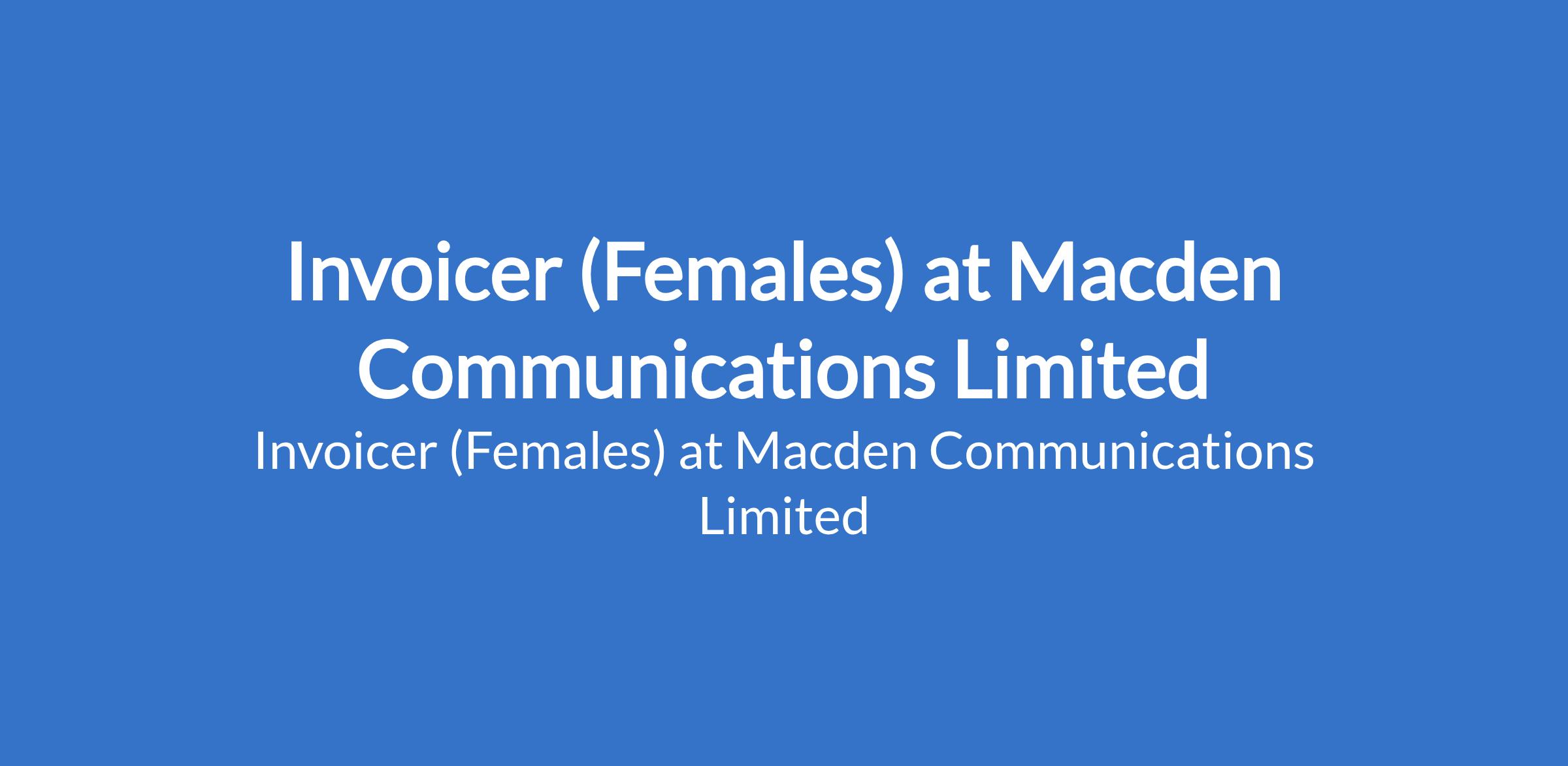 Macden Communications Limited is recruiting to fill the position of: Invoicer (Female). The position is located in Mbaisi, Imo State. Salary: N65,000 - N70,000 monthly. Interested candidate must have working experience as an invoicer and must be knowledgeable in business and should be able to use computer softwares.