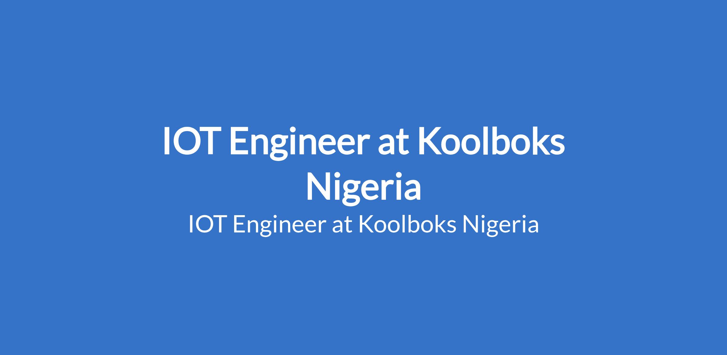 Koolboks Nigeria is recruiting to fill the position of: IOT Engineer. The position is located in Igando, Lagos State. Salary: N200,000 - N300,000 per month. Interested candidates should possess a B.Sc Degree or HND in Electrical Engineering, Electronics, Computer Engineering, or a related field with experience.