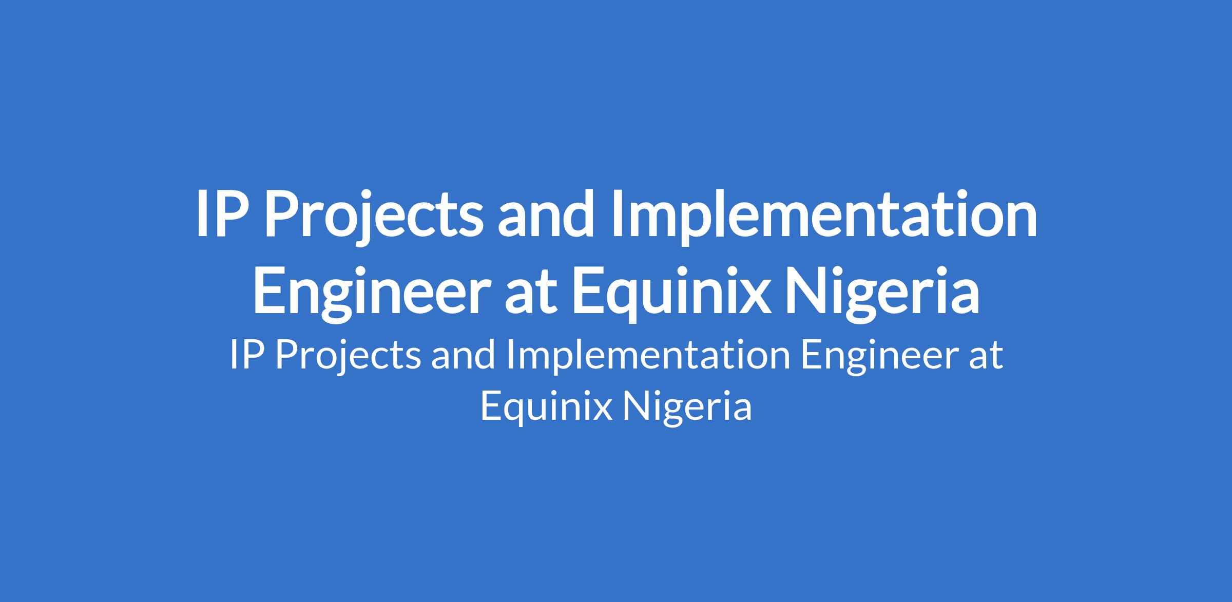 Equinix Nigeria is recruiting to fill the position of: IP Projects and Implementation Engineer. The position is located in Victoria Island, Lagos State. Interested candidates should possess a Bachelor's Degree or equivalent experience, CompTIA A+ / Network+ with relevant work experience.