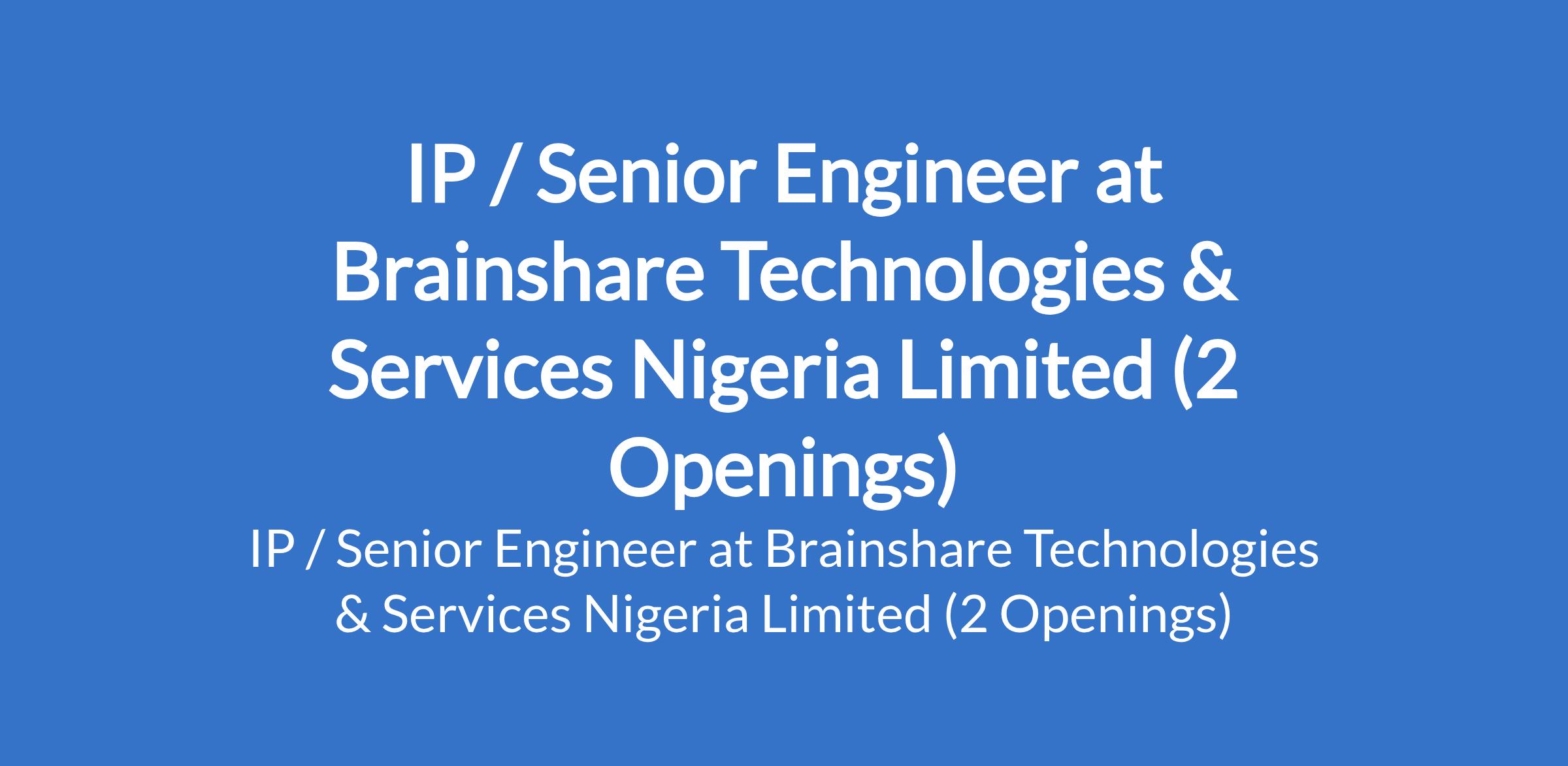 Brainshare Technologies & Services Nigeria Limited is recruiting to fill the position of: IP / Senior Engineer. The position is located in Lekki Phase 1, Lagos Island, Lagos State. Interested candidates should possess a Bachelors Degree in Electrical / Electronics Engineering, Computer Engineering, Computer Science, or related field with 58 years of relevant experience in IP networking and switching; professional certifications such as CCNP, CCIE, or equivalent are highly preferred.