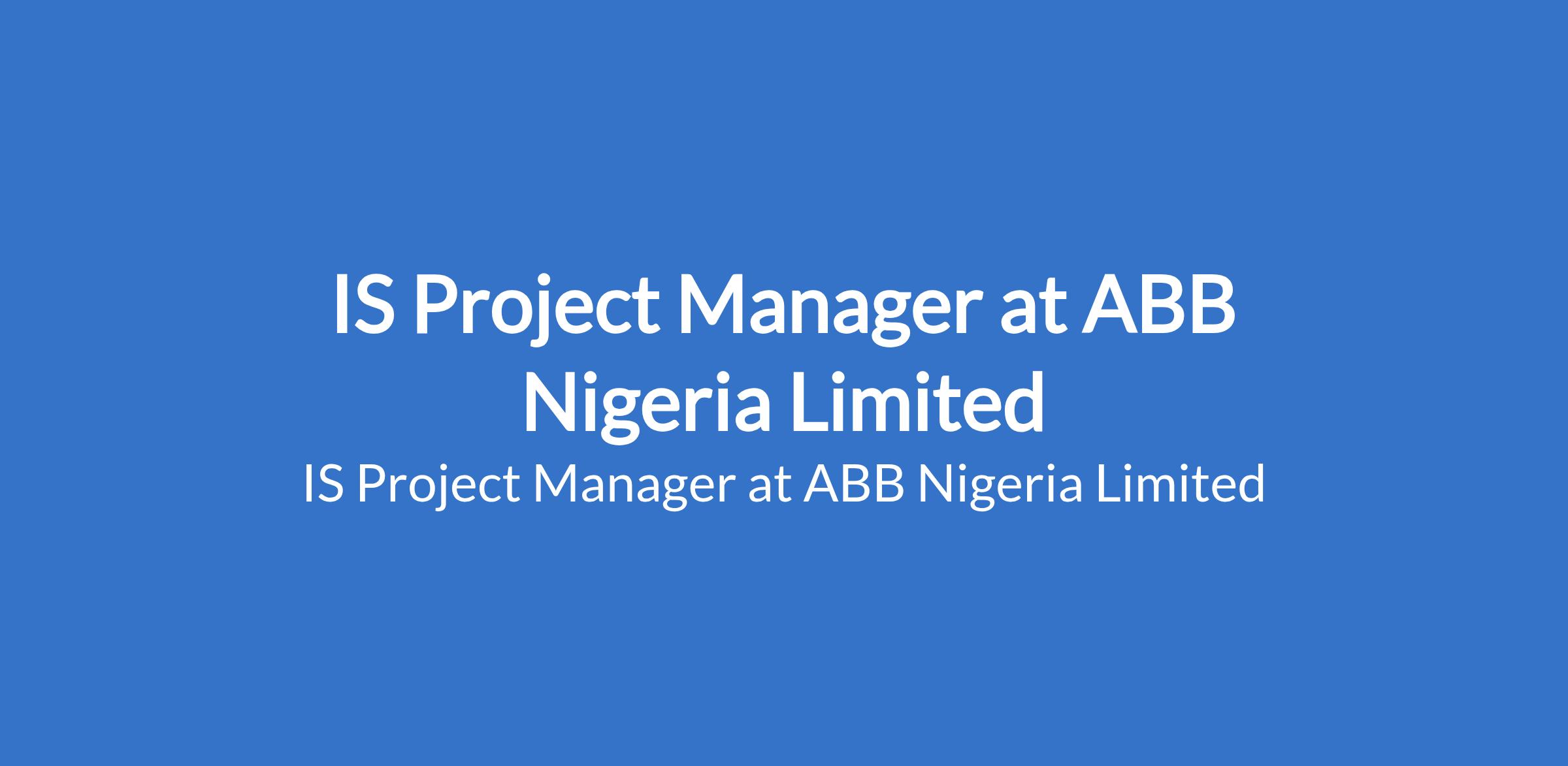 ABB Nigeria Limited is recruiting to fill the position of: IS Project Manager. In this role, you will contribute to the planning, coordination, and delivery of Information Systems (IS) initiatives, working closely with experienced project managers, technical teams, and business stakeholders. Interested candidates should possess relevant qualifications with 13 years of experience in project coordination or project management roles within IT or Information Systems environments.