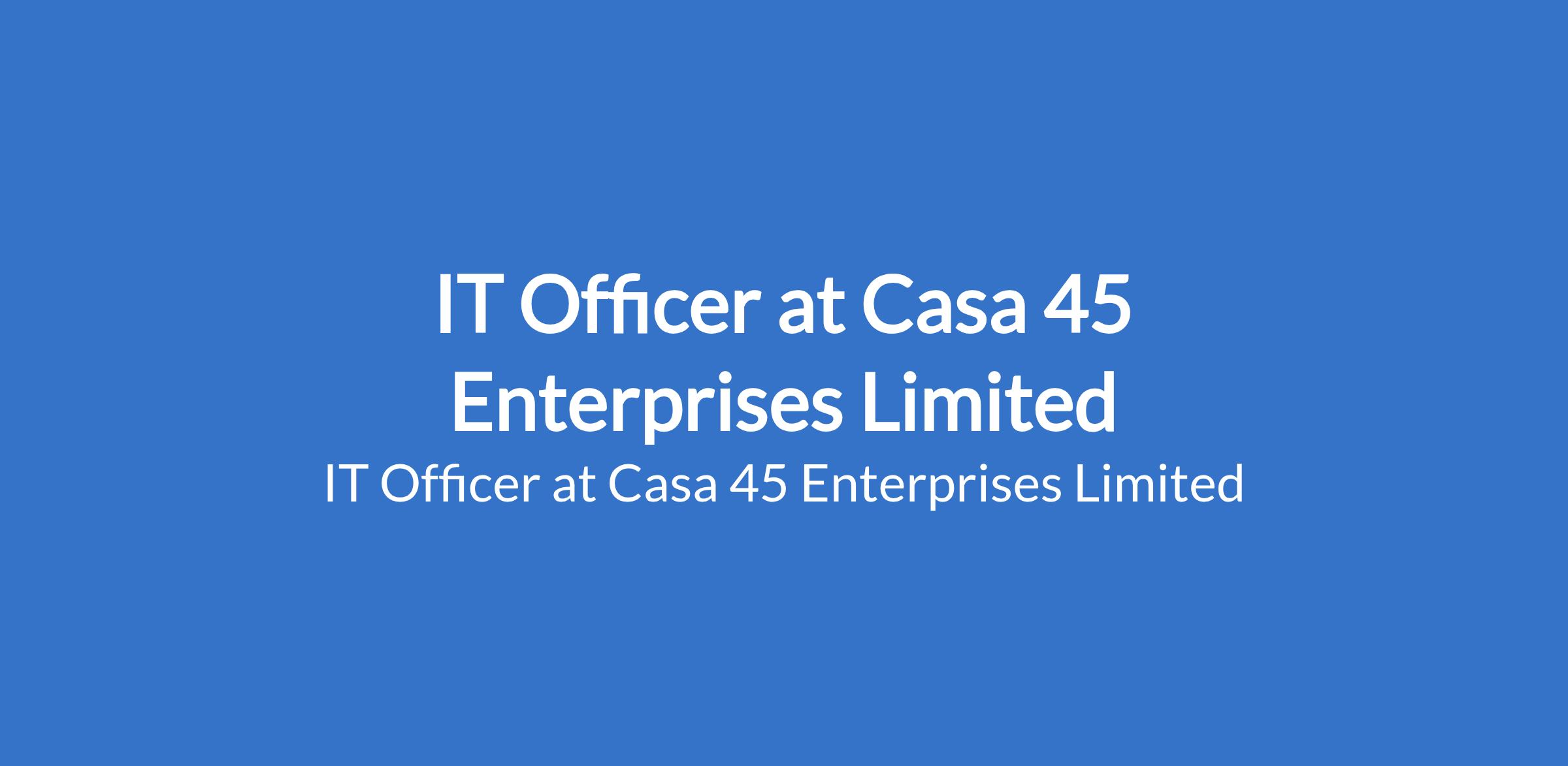 Casa 45 Enterprises Limited is recruiting to fill the position of: IT Officer. The position is located in Victoria Island, Lagos State. Salary: N300,000 - N350,000 / month. Interested candidates should possess relevant qualifications and work experience.
