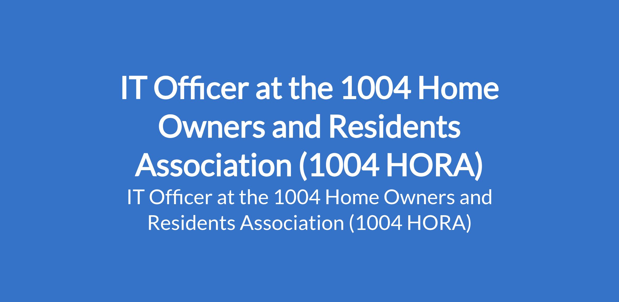 The 1004 Home Owners and Residents Association (1004 HORA) is recruiting to fill the position of: IT Officer. The position is located in Victoria Island, Lagos State. Interested candidates should possess a Bachelors Degree or HND in Computer Science, Information Technology, or related field with 35 years proven experience in IT support or similar role.