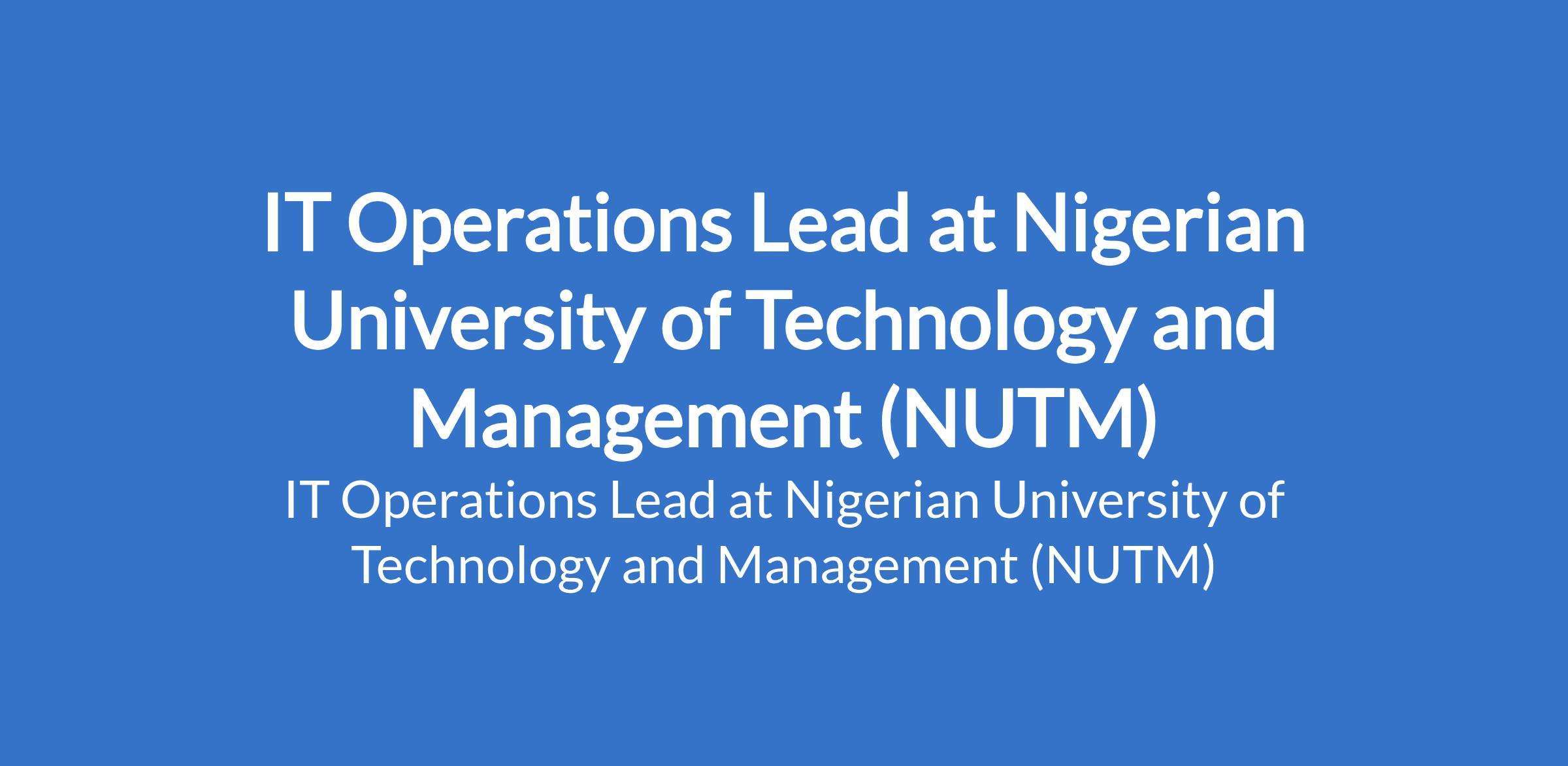 Nigerian University of Technology and Management (NUTM) is recruiting to fill the position of: IT Operations Lead. The position is located in Lagos State. Interested candidates should possess a Bachelors Degree in Computer Science, IT, or relevant fields with proven experience as IT Operations Lead.