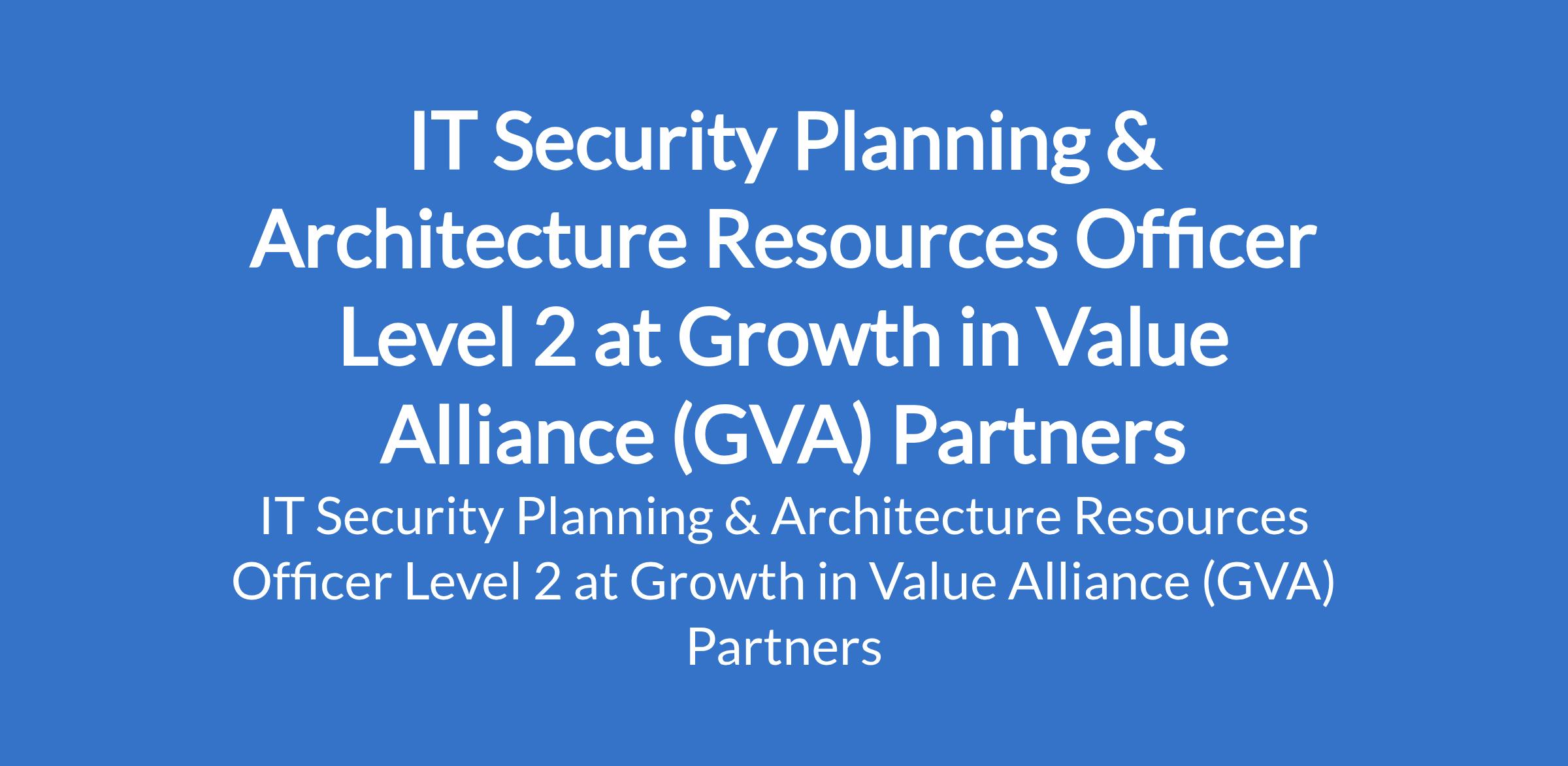 Growth in Value Alliance (GVA) Partners is recruiting to fill the position of: IT Security Planning & Architecture Resources Officer Level 2. The position is located in Lagos State. Interested candidates should possess relevant qualifications with a minimum of Four (4) years work experience of which includes three (3) years Security Architecture experience.