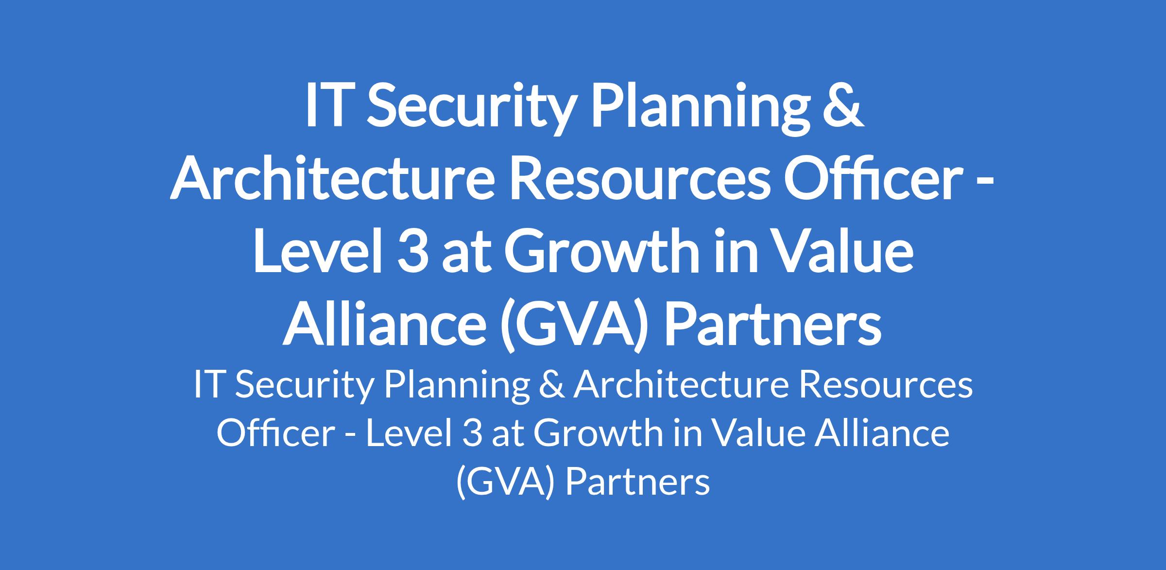 Growth in Value Alliance (GVA) Partners is recruiting to fill the position of: IT Security Planning & Architecture Resources Officer - Level 3. The position is located in Lagos State. Interested candidates should possess relevant qualifications with a minimum of eight (8) years work experience of which includes four (4) years experience integrating applications and technology into a complex environment.