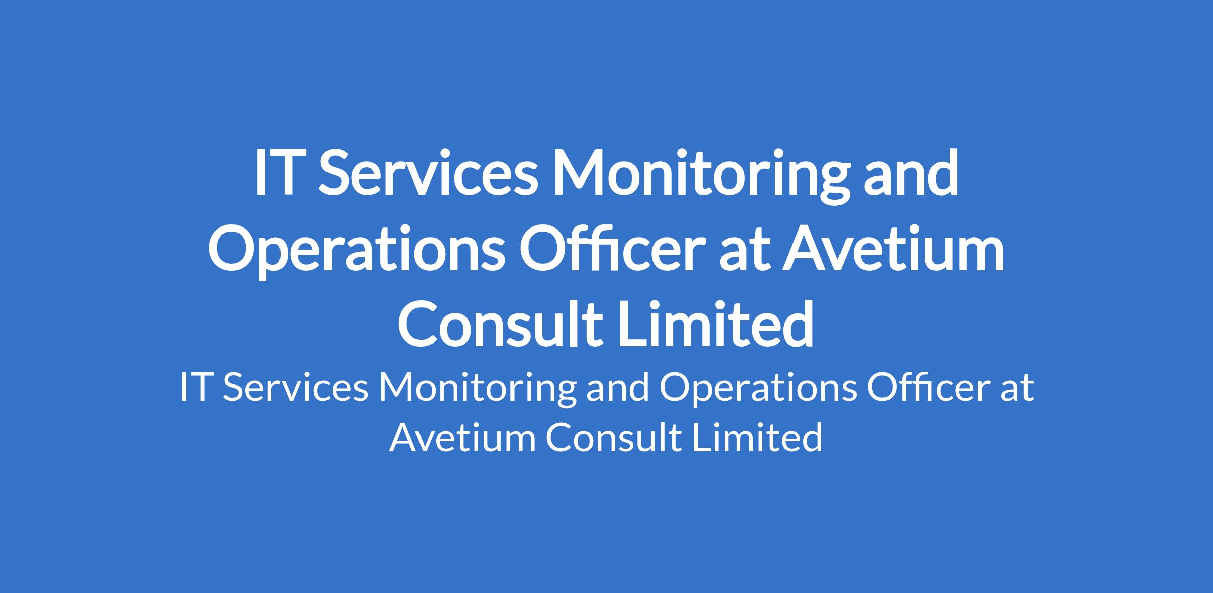 Avetium Consult Limited is recruiting to fill the position of: IT Services Monitoring and Operations Officer. The position is located in Lagos State. Salary: N190,000 monthly. Interested candidates should possess a Bachelors Degree in Computer Science, IT, or related field with 0-3 years of experience in IT monitoring, help desk, or related role.
