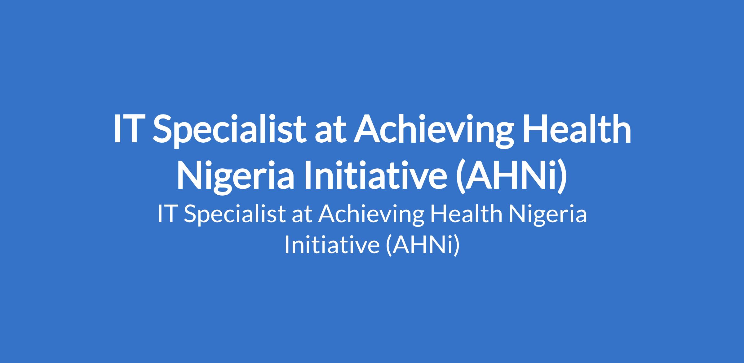 Achieving Health Nigeria Initiative (AHNi) is recruiting to fill the position of: IT Specialist. The position is located in Anambra State. Interested candidates should possess a Degree or Higher National Diploma (HND) in Computer Science, Health Information Management, or recognized equivalent, with 2 - 3 years post-NYSC experience.