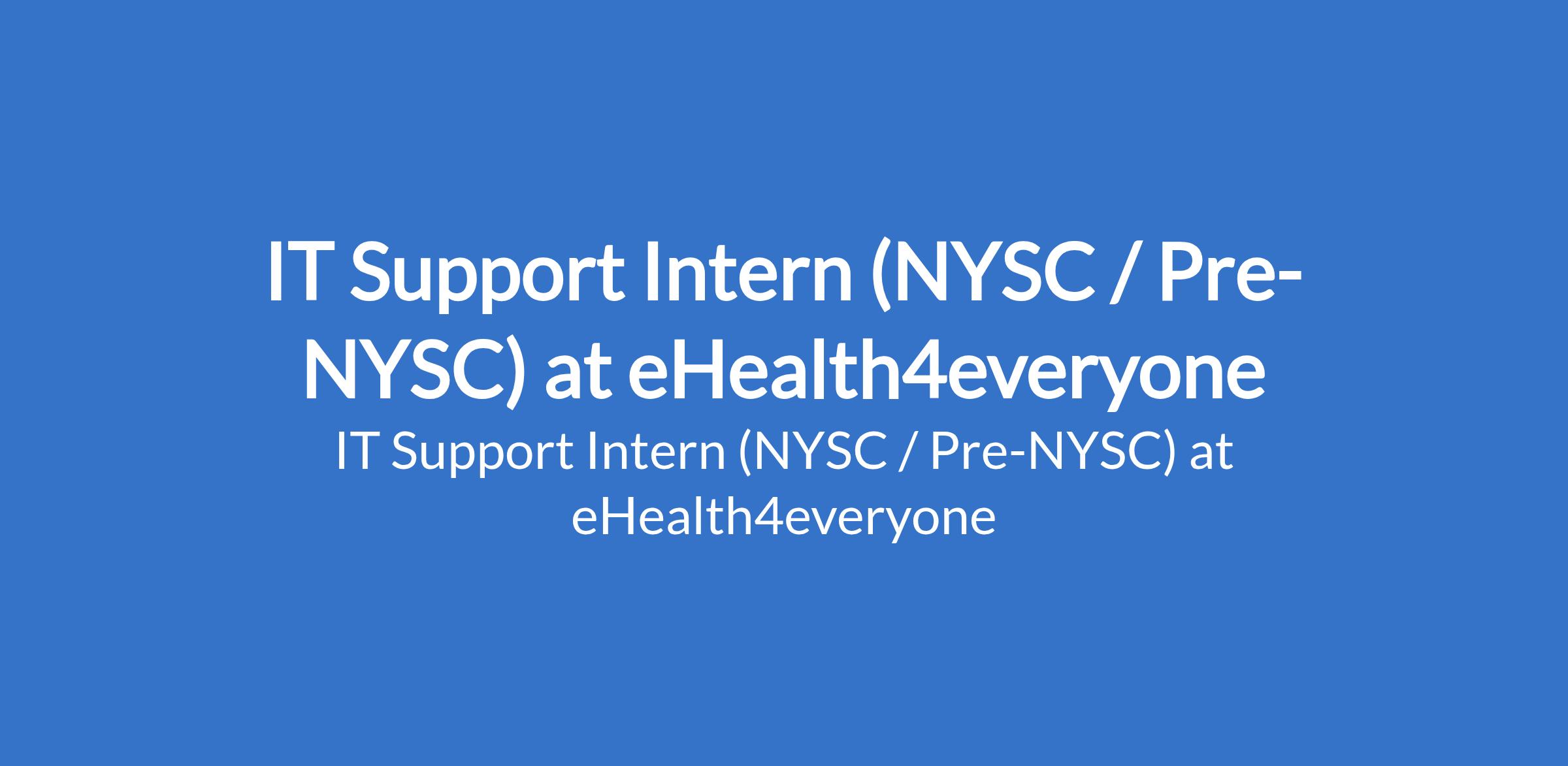 eHealth4everyone is recruiting to fill the position of: IT Support Intern (NYSC / Pre-NYSC). The position is located in Abuja (FCT). Interested candidates should possess a Degree in Computer Science, Information Science, Mathematics or any closely related field.
