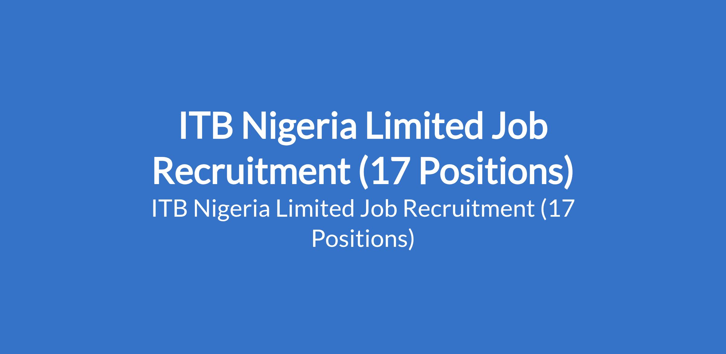 ITB Nigeria Limited is recruiting suitable candidates to fill the following positions: Mason, Tiler, Painter, Scaffolder, Plant Operator, General Construction Laborer, Carpenter (Formwork), Steel Fixer (Iron Bender), Storekeeper, Human Resources Support Officer (HRSO), Document Control Officer, Land Surveyor, Site Nurse, and Geologist.