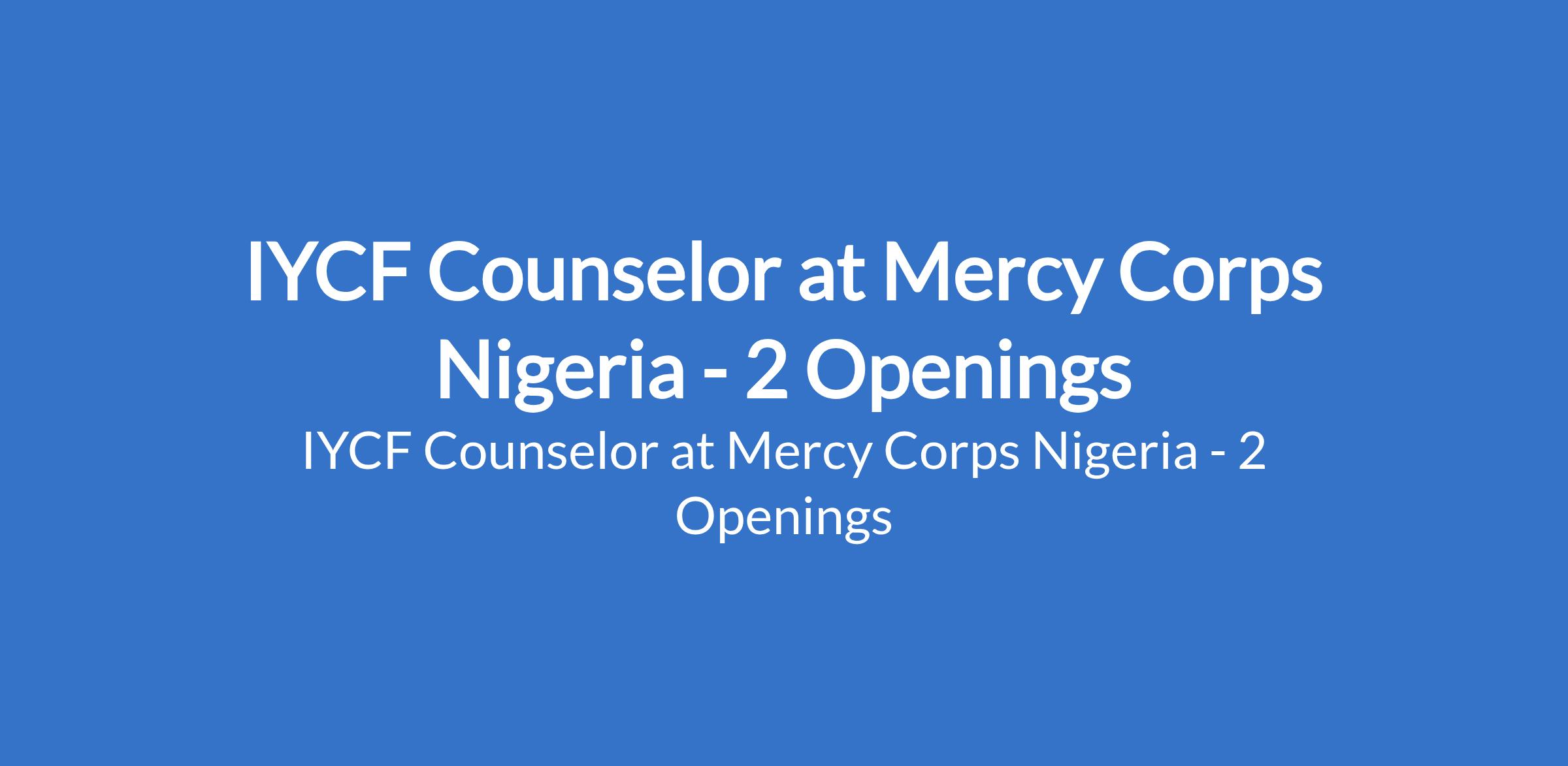 Mercy Corps Nigeria is recruiting to fill the position of: IYCF Counselor. The position is located in Konduga, Jere - Borno, and Yobe States. Interested candidates should possess a Diploma/ Degree in nursing, midwifery, public health, nutrition with a minimum of two years work experience in an NGO environment.