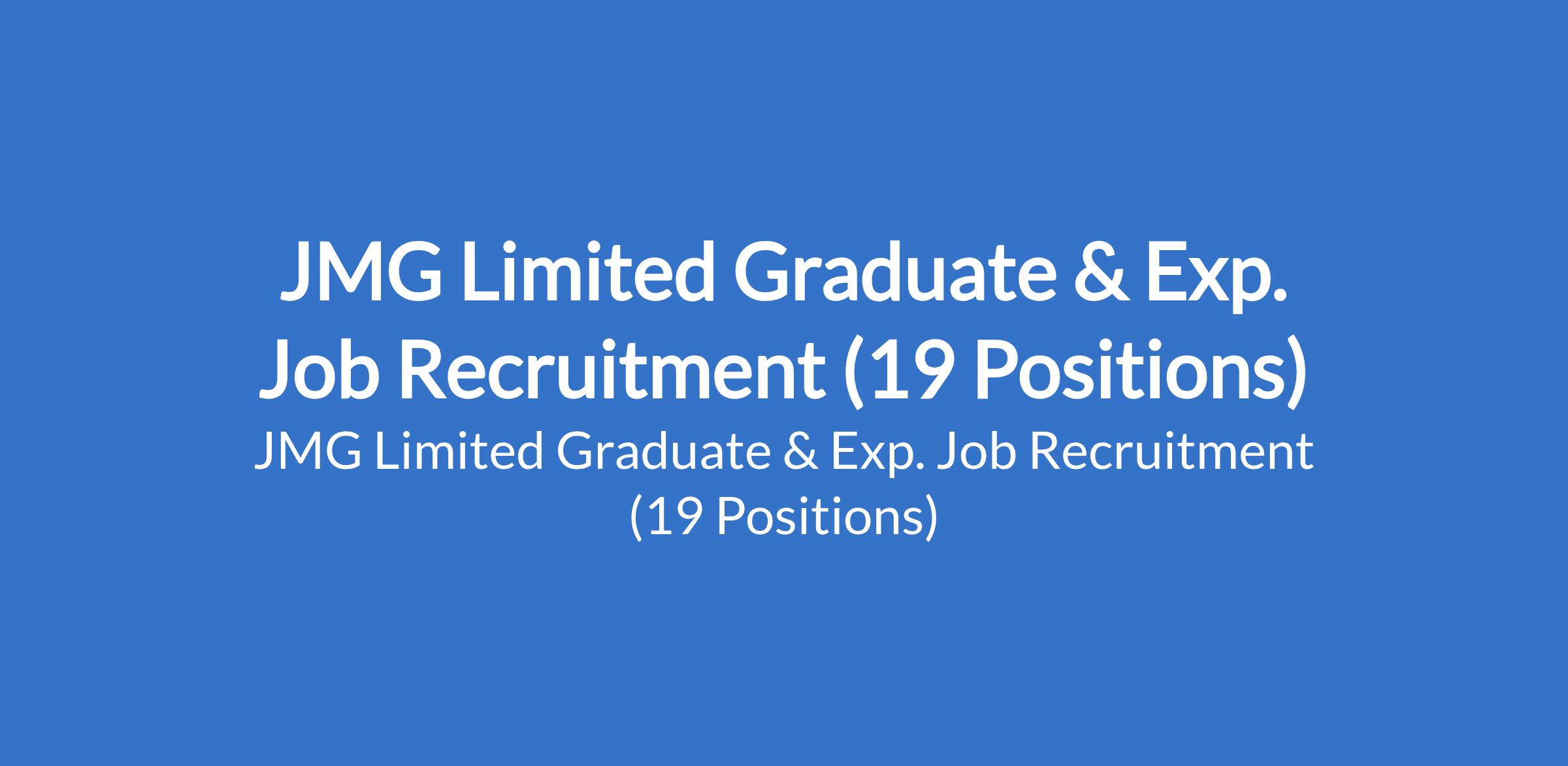 JMG Limited is recruiting suitable candidates to fill the following graduate and experienced positions in Lagos and Oyo States: Graduate Electrical & Electronics Engineer, Production Supervisor; Mechanical Assembler; Electrical Assembler; Account Officer (Bank Reconciliation); Legal Manager; Vulcanizer; HVAC Technician Copper Installer; Compliance Officer; Field Electrical Engineer; Production Supervisor (Cutting and Bending); Field Mechanical Engineer; CNC Mechanical Engineer (Laser Machines); Heavy-duty Mechanic; Vehicle Workshop Inspector; Business Intelligence and Analytics Manager; Branch Manager Generator Sales Division; and Legal Manager.