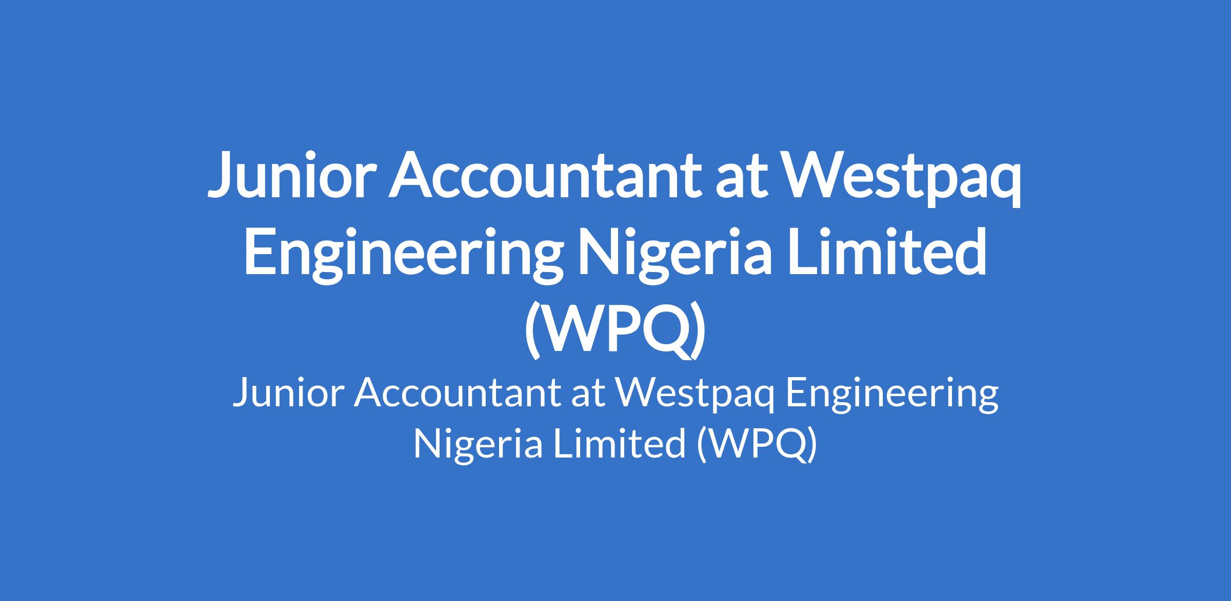 Westpaq Engineering Nigeria Limited (WPQ) is recruiting to fill the position of: Junior Accountant. The position is located in Lagos State. Interested candidates should possess a Bachelors Degree (BSc/HND) in Accounting, Finance, or a related field with 13 years of relevant accounting experience.