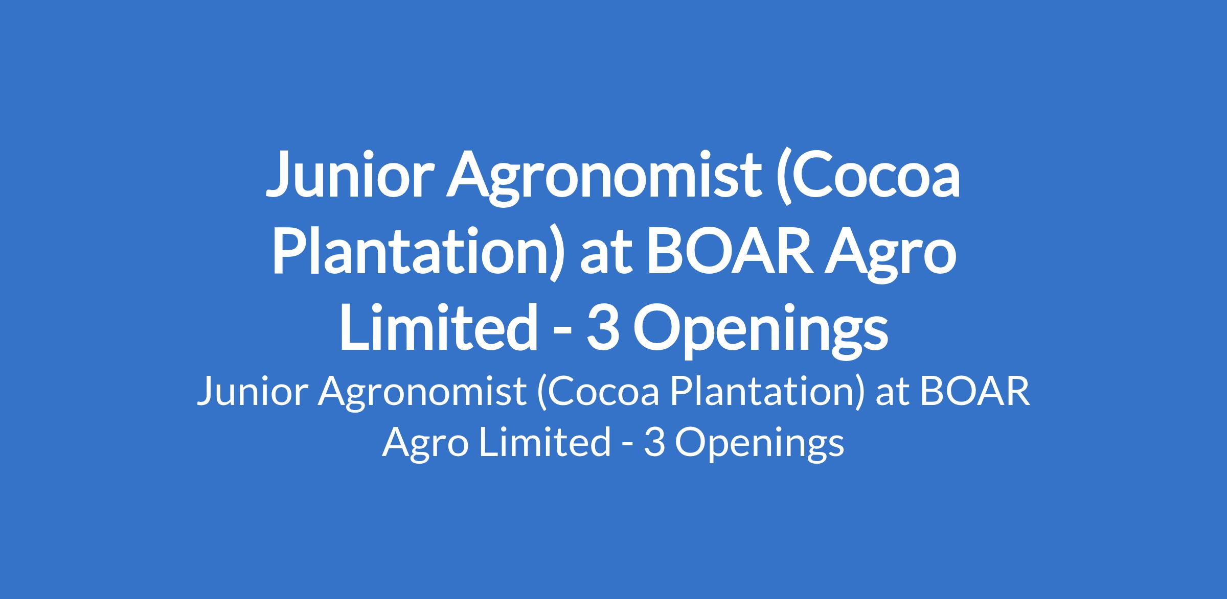 BOAR Agro Limited is recruiting to fill the position of: Junior Agronomist (Cocoa Plantation). The position is located in Lagos, Ogun, and Osun States. Interested candidates should possess a Diploma or B.Sc. in Agronomy, Agriculture, Crop Science, or related fields with 13 years practical experience in cocoa or tree crop farming (field-based).