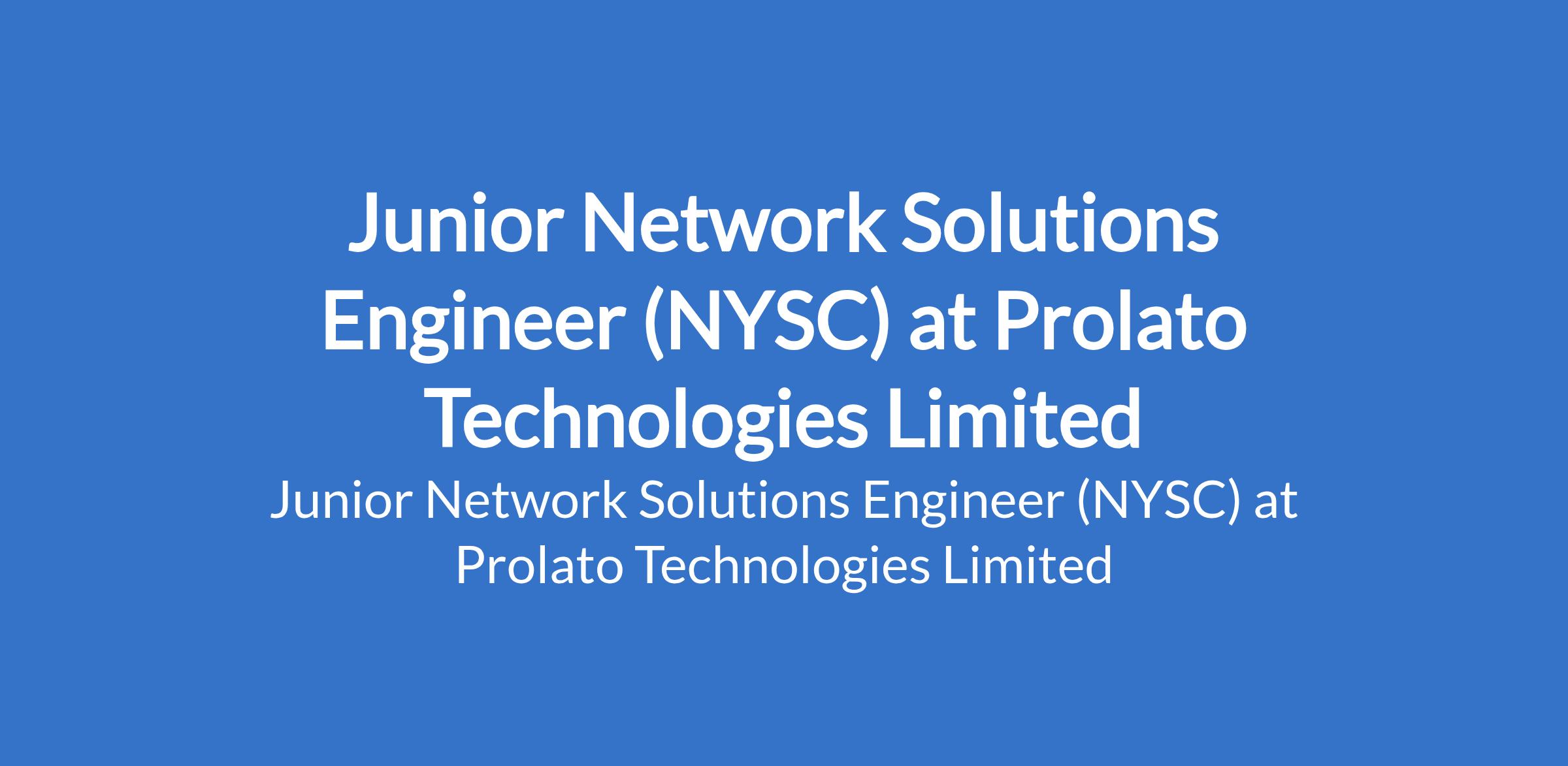 Prolato Technologies Limited is recruiting to fill the position of: Junior Network Solutions Engineer (NYSC). The position is located in Surulere, Lagos State. Interested candidates should possess a minimum academic qualification of Bachelors Degree in Computer Science or a technology-related field from a recognized University with 0-2 years experience in network engineering.