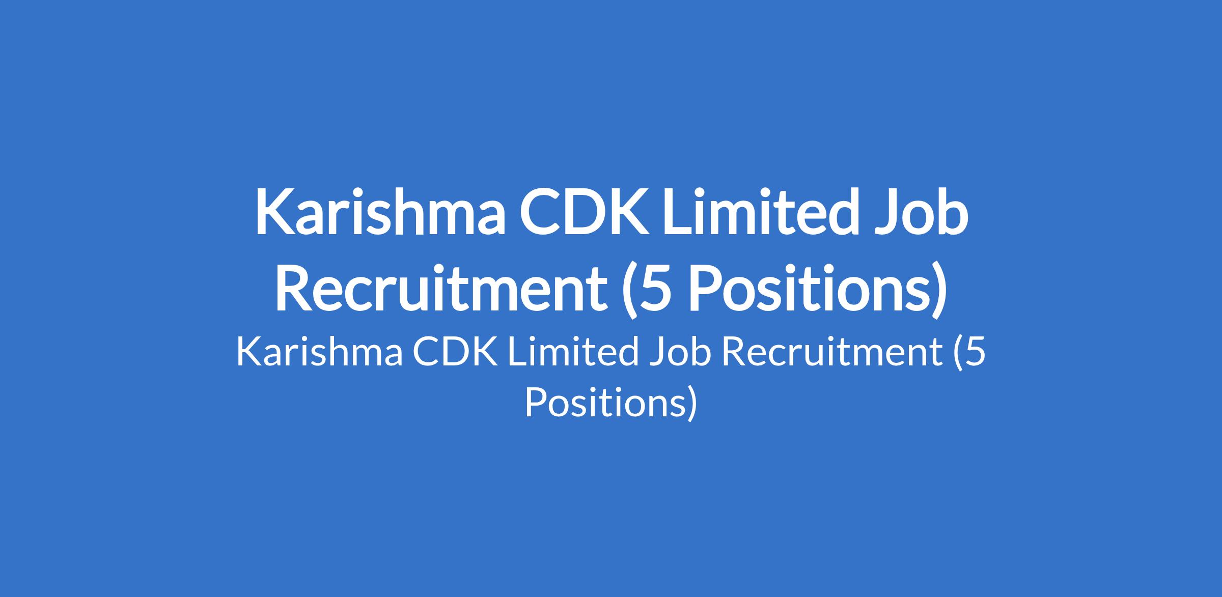Karishma CDK Limited is recruiting suitably qualified candidates to fill the following positions in Kano and Ogun States: Accountant, Administrative and People Operations Assistant, Client Services Officer, Field Buying / Sourcing Officer, and Quality Control Inspector.