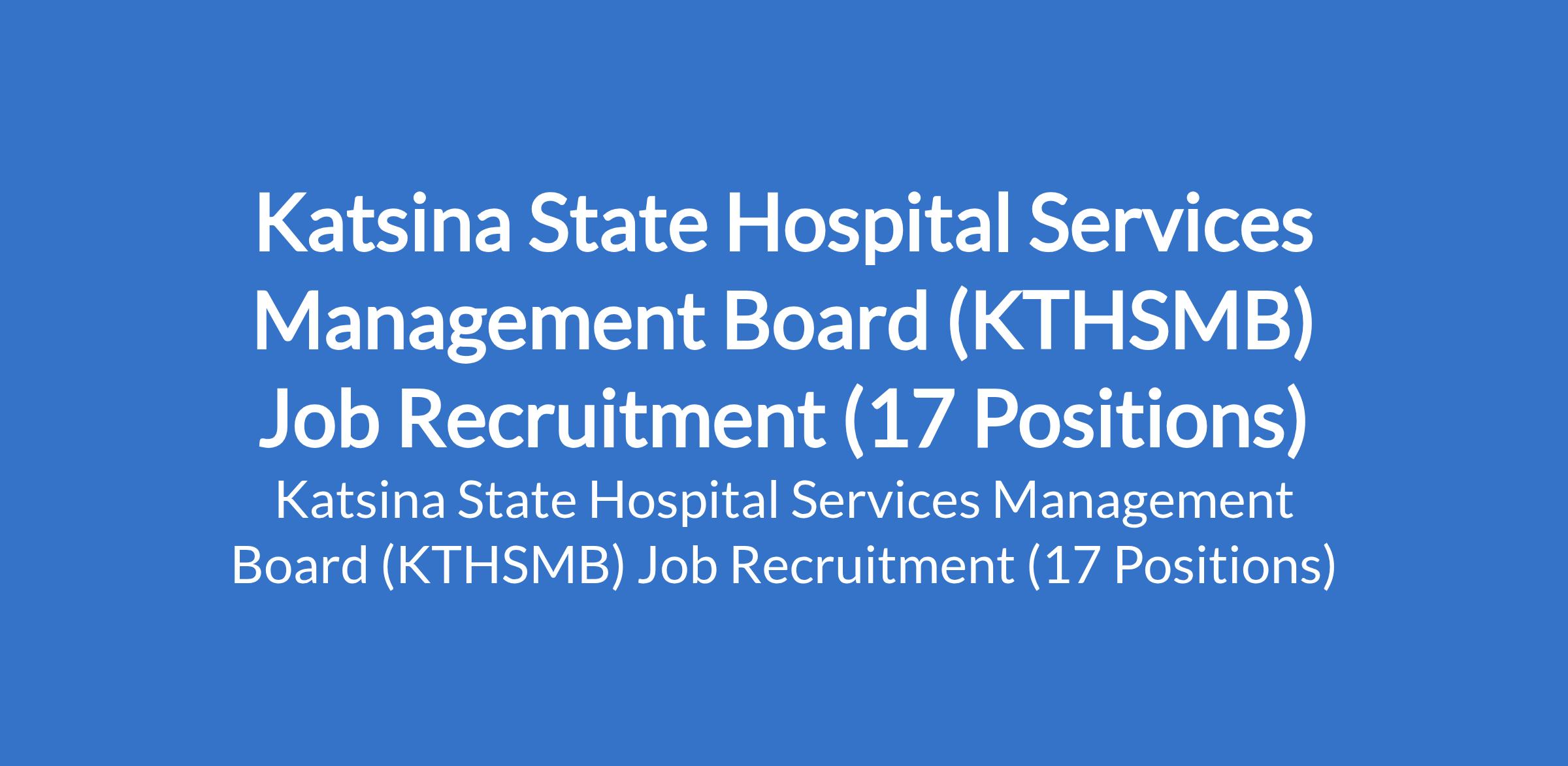 Katsina State Hospital Services Management Board (KTHSMB) invites applications from suitable candidates to fill the following positions: Medical Consultant, Accountant, Pharmacy Technician, Pharmacist, Midwive Officer, Nursing Officer III, Nursing Officer I, Medical Laboratory Technician, Medical Record Technician (MRT), Dental Technician, Dental Therapist, X-Ray Technician, Radiographer, Computer Analyst, Administrative Officer, Medical Laboratory Scientist, and Medical Officer.