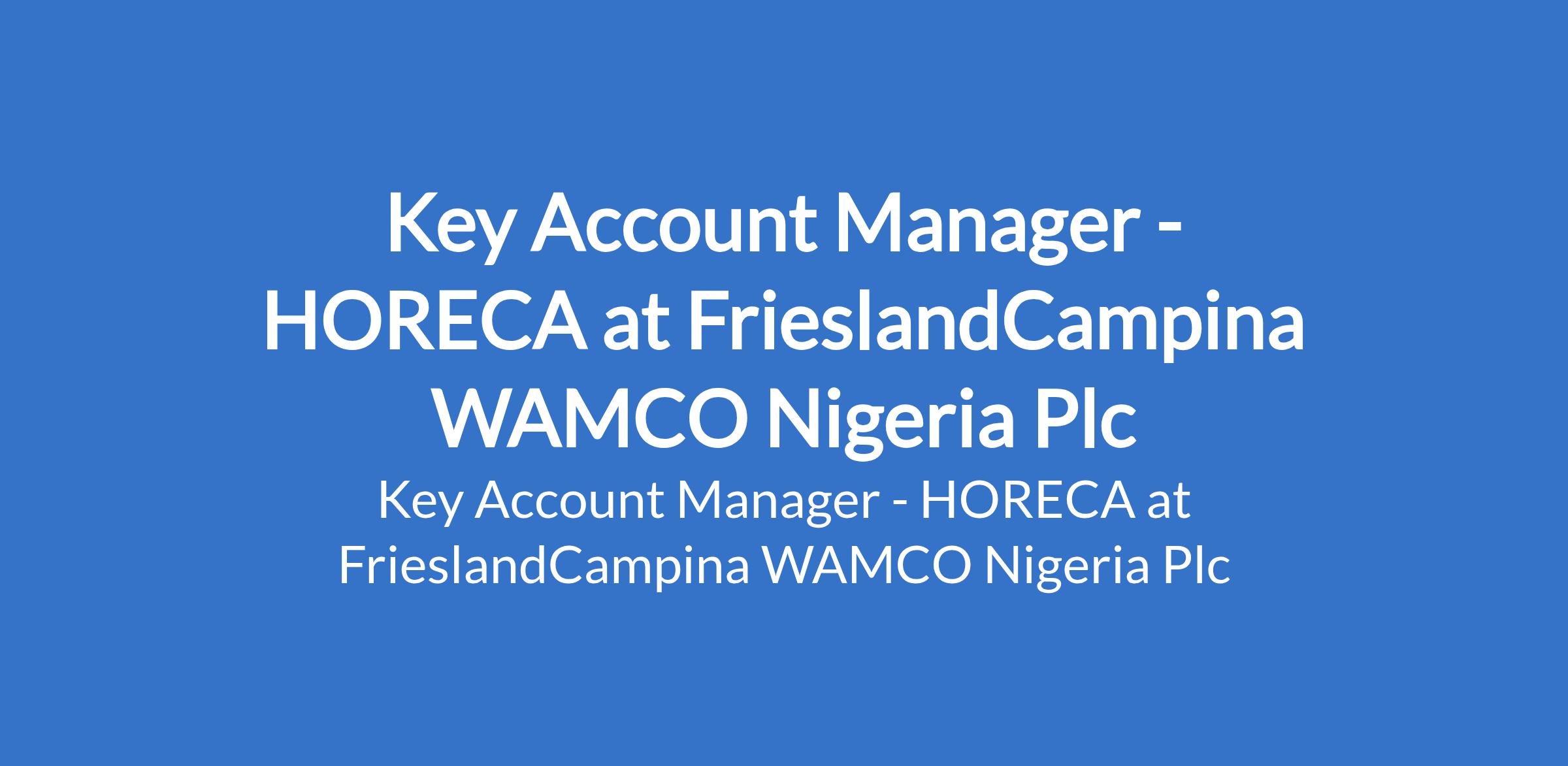 FrieslandCampina WAMCO Nigeria Plc is recruiting to fill the position of: Key Account Manager - HORECA. Interested candidates should possess a First Degree in any discipline with a minimum of 3 years in sales management.