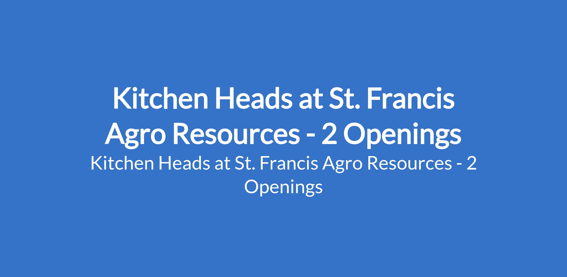 St. Francis Agro Resources is recruiting to fill the position of: Kitchen Head. The position is located in Enugu State. Salary: N60,000 / month. Interested candidates should possess a relevant qualifications; must be physically fit and hardworking and must be based in or around Enugu.