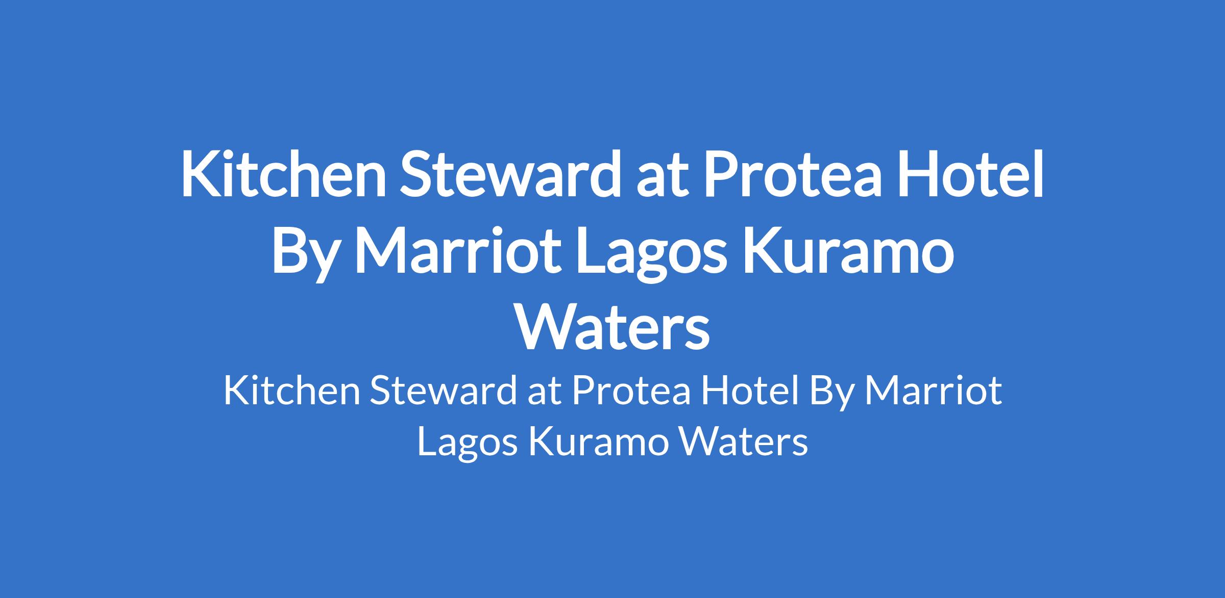 Protea Hotel By Marriot Lagos Kuramo Waters is recruiting to fill the position of: Kitchen Steward. The position is located in VI, Lagos State. Interested candidates should possess a relevant qualification.