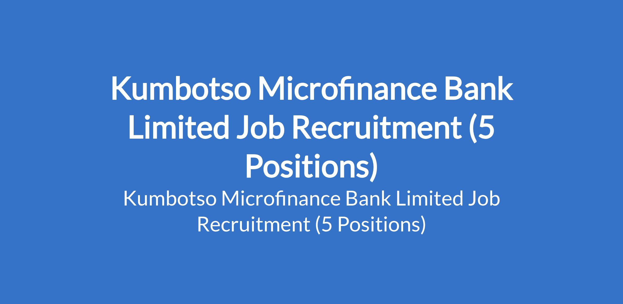 Kumbotso Microfinance Bank Limited is recruiting suitably qualified candidates to fill the following positions in Kano State: Managing Director / CEO, Head of Internal Audit / Compliance Unit, Head of ICT / MIS, Head of Marketing Finance / Risk Management, and Head of Operation.