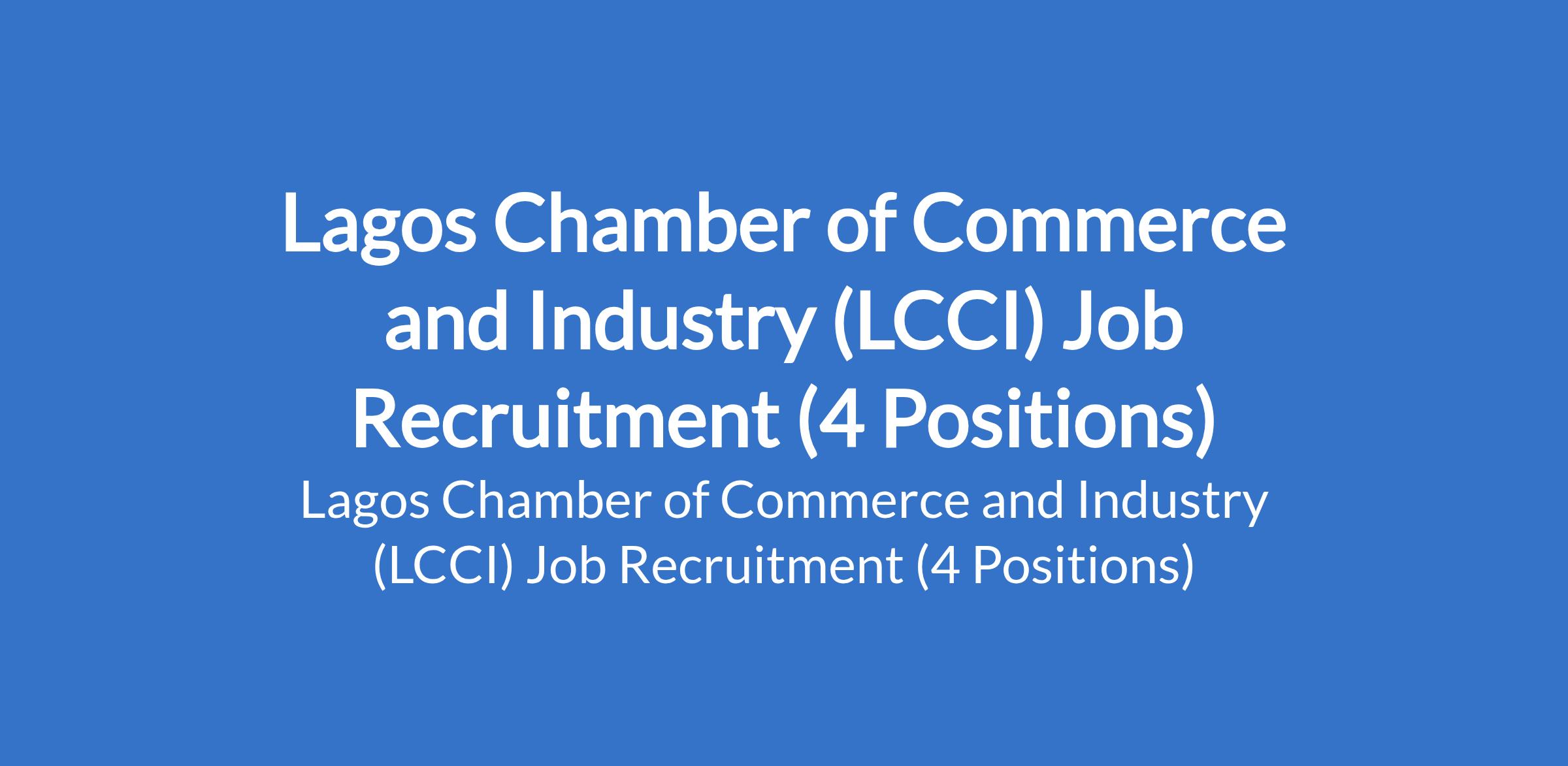 Lagos Chamber of Commerce and Industry (LCCI) is recruiting suitable candidates to fill the following positions in Lagos State: International & Public Sector Relations Officer; Assistant Manager, International & Public Sector Relations (Permanent); Quantity Surveyor / Assistant Manager, Trade Promotion; and Social Media & Digital Marketing Manager.