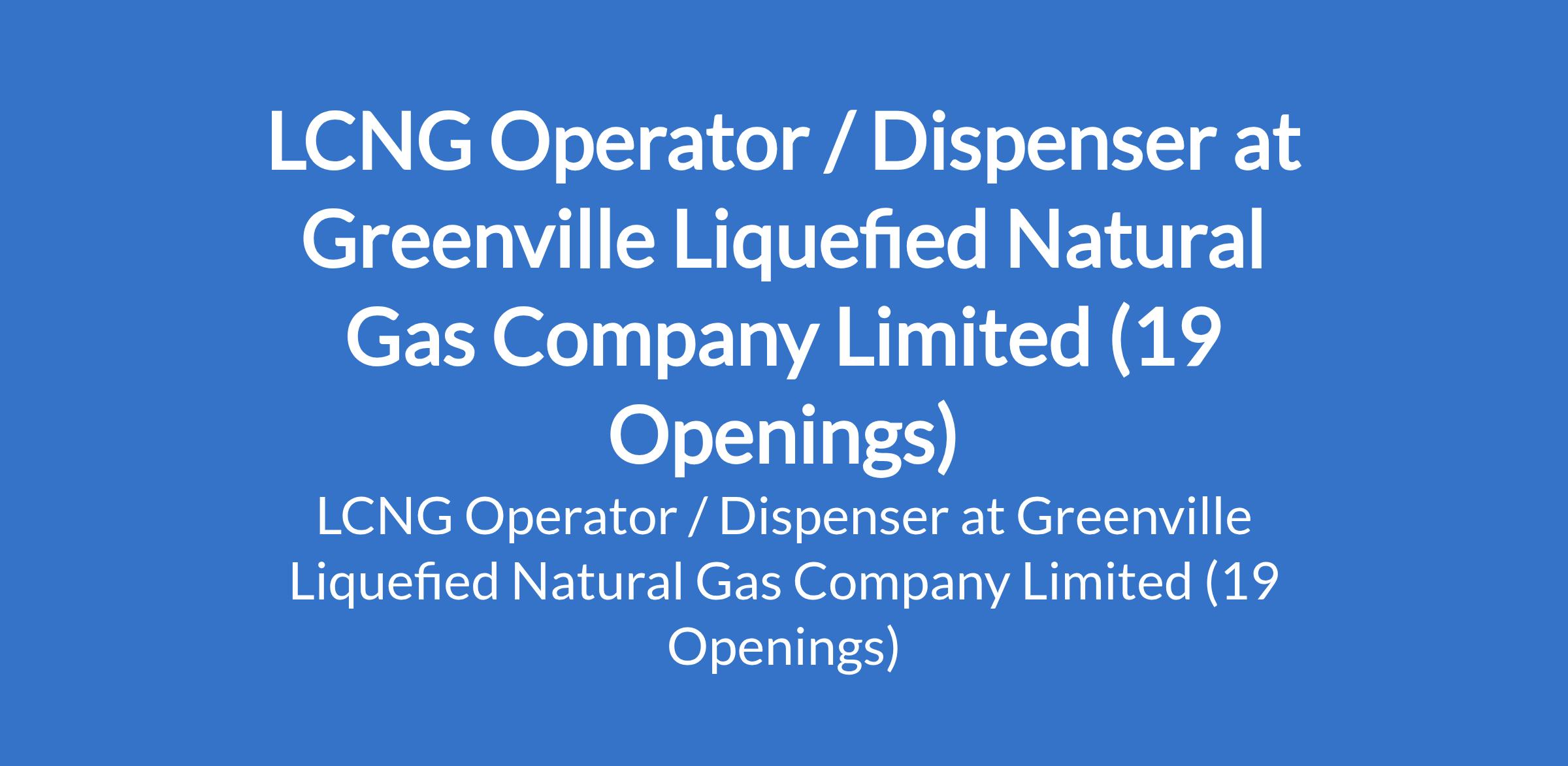 Greenville Liquefied Natural Gas Company Limited is recruiting to fill the position of: LCNG Operator / Dispenser. The position is located in Port Harcourt - Rivers: Potiskum - Yobe; Ilorin - Kwara; Sokoto; Jos - Plateau; Kaduna; Kano; Katsina; Abeokuta - Ogun; Lafia - Nasarawa; Lokoja - Kogi; Maiduguri - Borno; Bauchi; Minna - Nigeri; Benin City - Edo; Calabar - Cross River; Enugu; Gombe; and Gusau - Zamfara States. Interested candidates should possess a minimum of National Diploma in a Science or Engineering based course.
