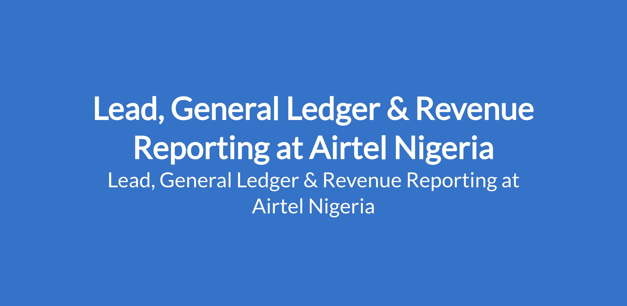 Airtel Nigeria is recruiting to fill the position of: Lead, General Ledger & Revenue Reporting. The position is located in Lagos State. Interested candidates should possess a Graduate Degree in Accounting or a related discipline with a minimum of 8 years of experience in FMCG or Telecom.