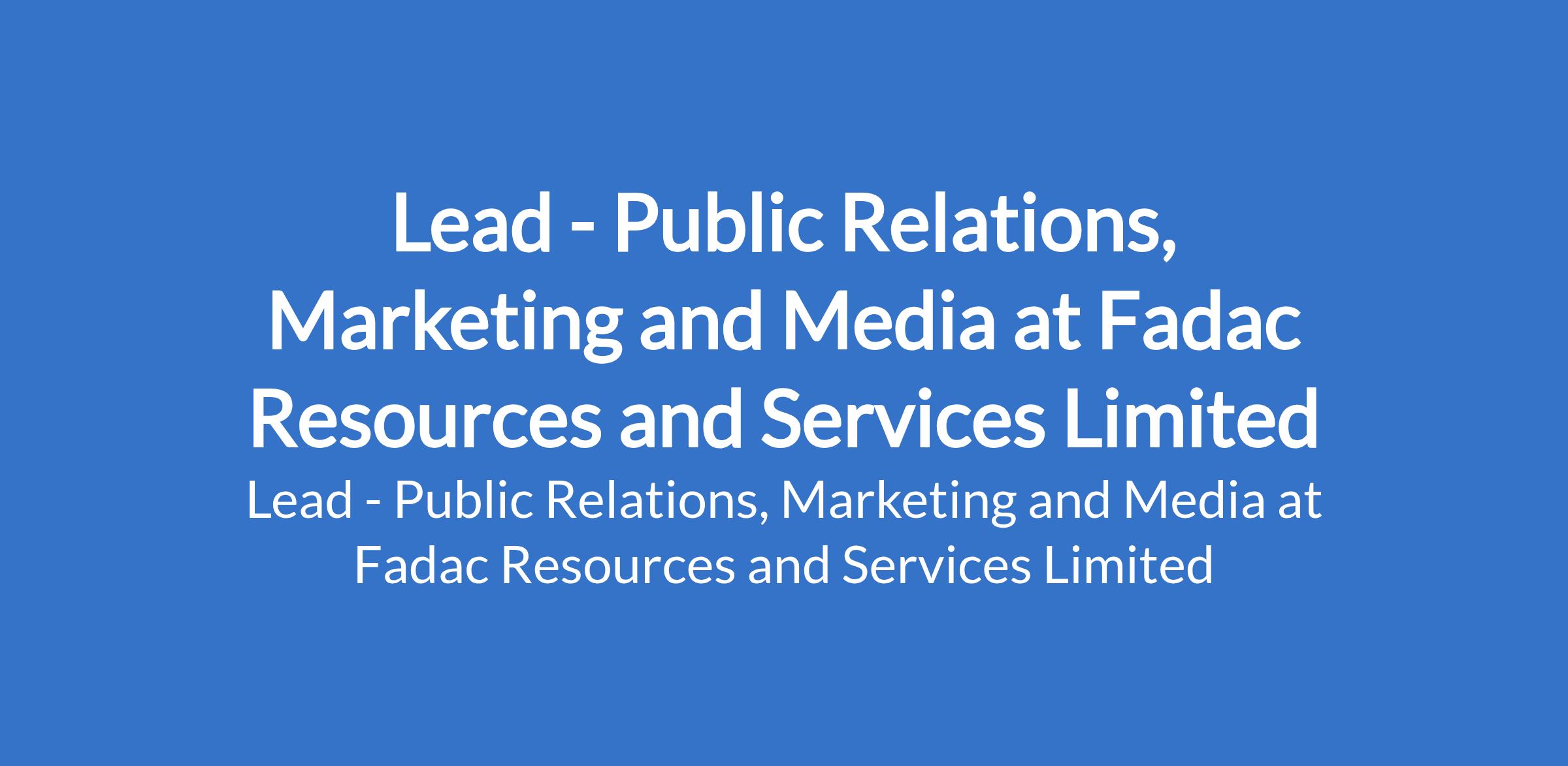 Fadac Resources and Services Limited is recruiting to fill the position of: Lead - Public Relations, Marketing and Media. The position is located in Lagos State. Interested candidates should possess a BSc Degree in Marketing, Communications, Media, Business or related fields with 5 - 8 years of experience in PR, marketing, communications or media within financial services, professional services or a corporate environment.