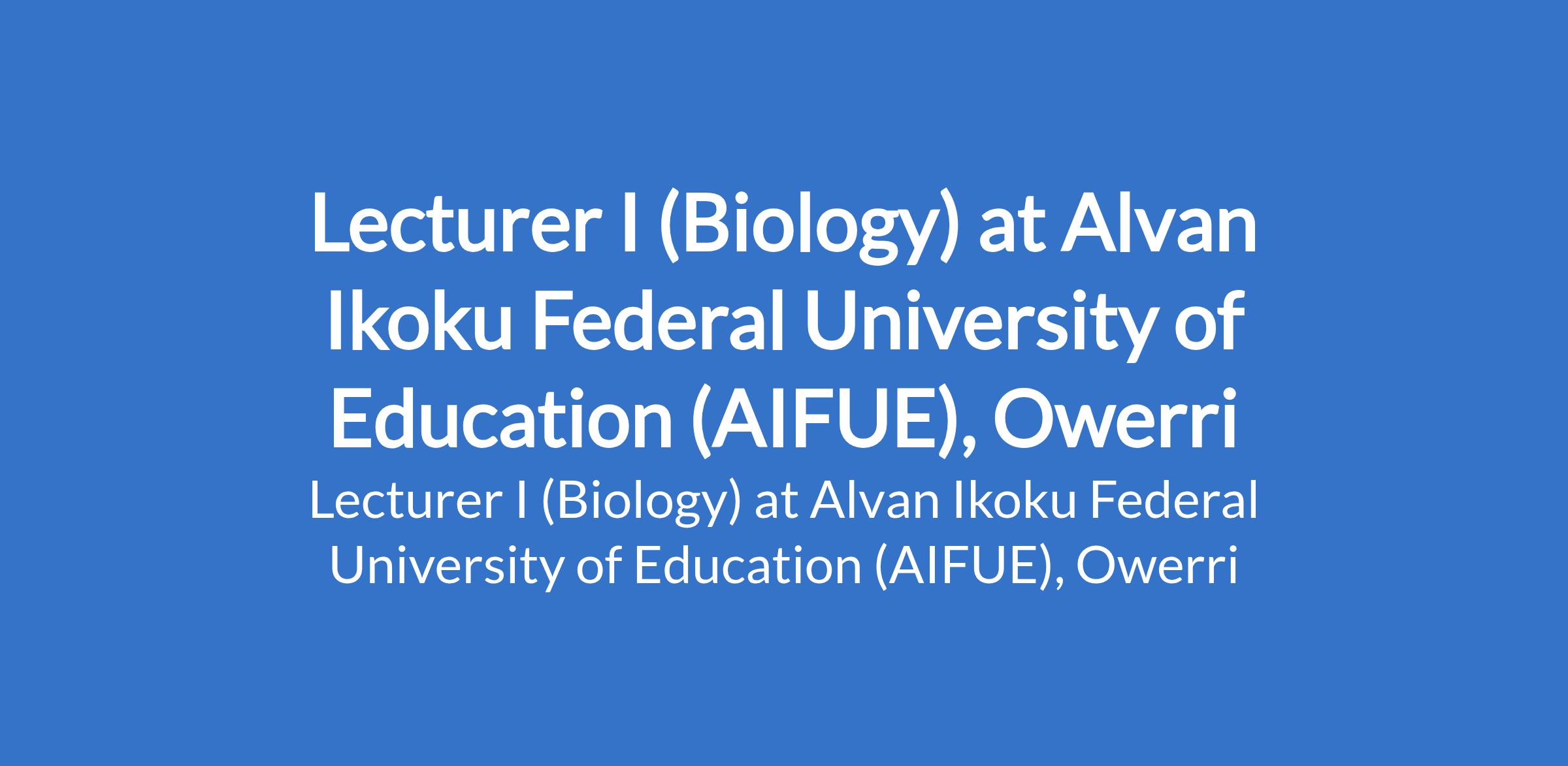 Alvan Ikoku Federal University of Education (AIFUE), Owerri invites applications from suitably qualified candidates for the position of: Lecturer I (Biology). The position is located in Imo State. Interested candidates should possess a Master's Degree in the relevant field with a minimum of 6 years of teaching and research experience, and not less than 3 years as a Lectuer II in a recognized university. A PhD in the relevant field shall be an advantage. Applicants must possess evidence of a teaching / research experience with scholary publications.