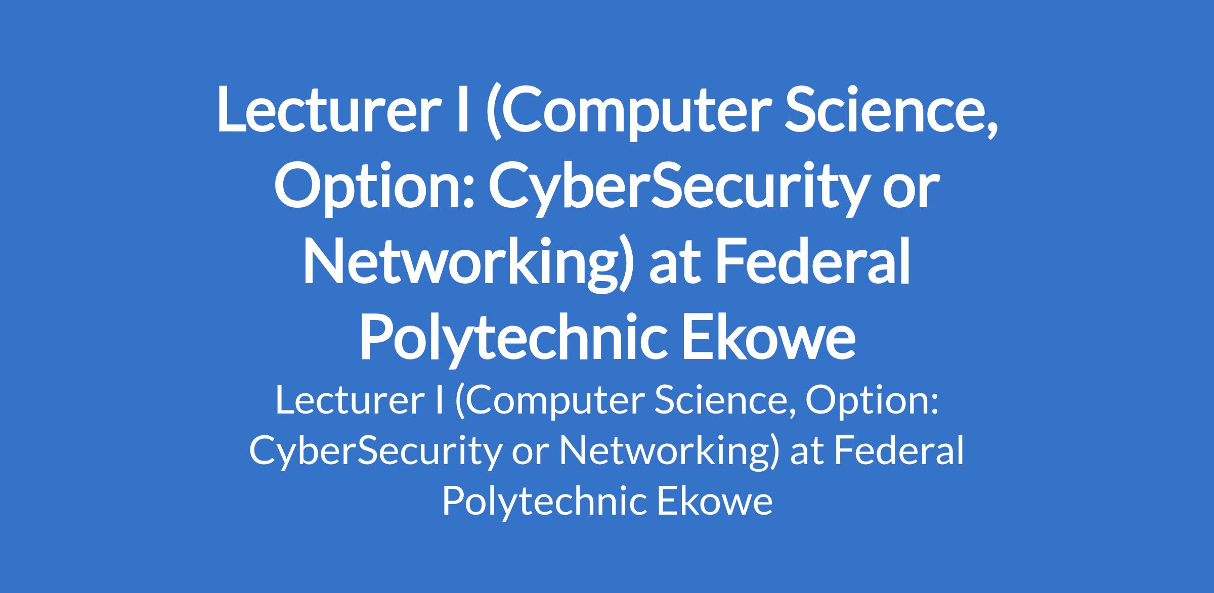 The Federal Polytechnic Ekowe invites applications from suitably qualified candidates for the position of: Lecturer I (Computer Science, Option: CyberSecurity or Networking). The position is located in Bayelsa State. Interested candidates should possess a a Mastar's Degree in relevant field from a recognized institution with at least six (6) years Or PhD. in relevant discipline with at least three (3) years teaching/research or industrial work experience; Must be registered with the relevant professional body.