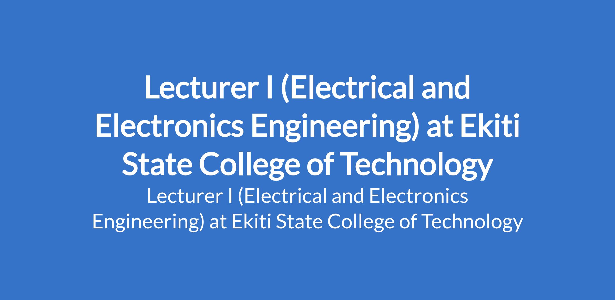 Ekiti State College of Technology is recruiting to fill the position of: Lecturer I (Electrical and Electronics Engineering). Interested candidates should possess a Master's Degree in Electrical and Electronics Engineering with a minimum of 9 years of cognate teaching and research experience in a Polytechnic; similar Technical and Vocational Education and Training (TVET) Institution is an added advantage, just as registration with the relevant professional body is necessary.
