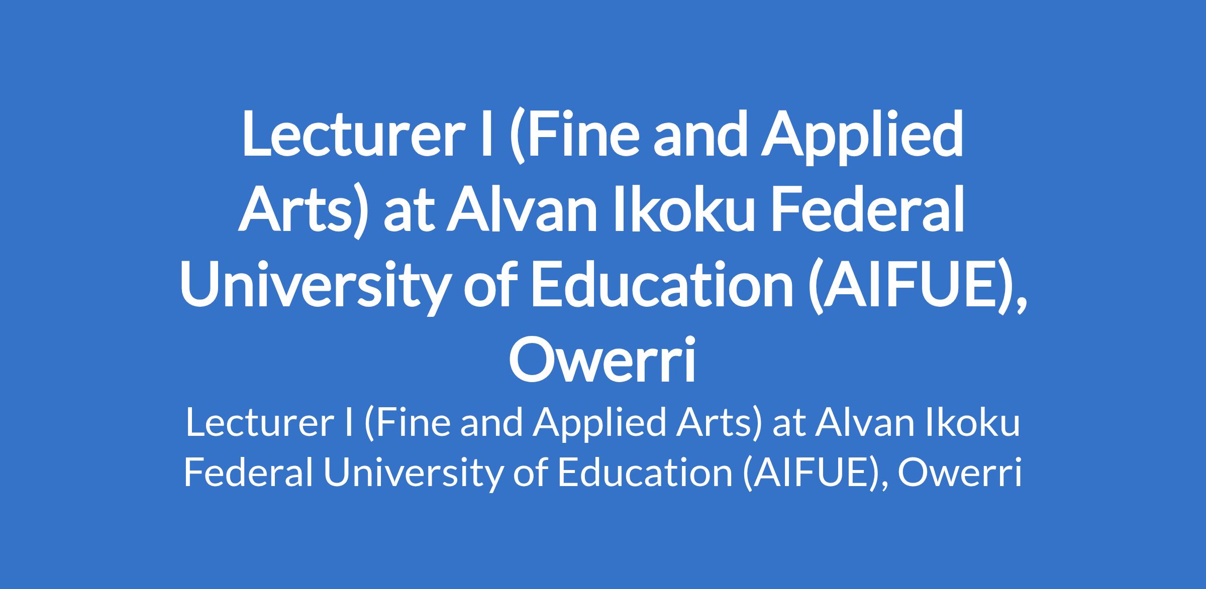 Alvan Ikoku Federal University of Education (AIFUE), Owerri invites applications from suitably qualified candidates for the position of: Lecturer I (Fine and Applied Arts). The position is located in Imo State. Interested candidates should possess a Master's Degree in the relevant field with a minimum of 6 years of teaching and research experience, and not less than 3 years as a Lectuer II in a recognized university. A PhD in the relevant field shall be an advantage. Applicants must possess evidence of a teaching / research experience with scholary publications.