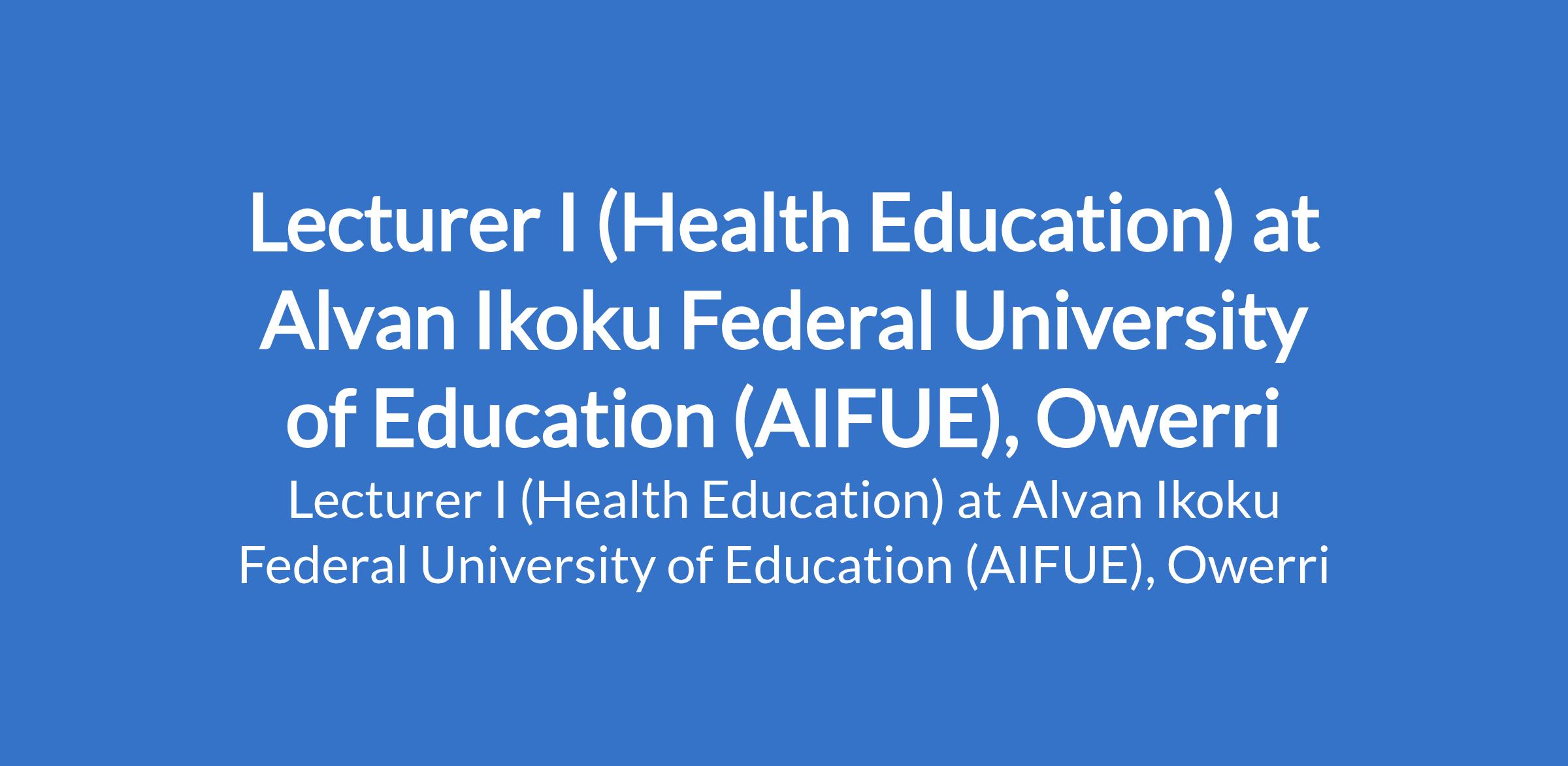 Alvan Ikoku Federal University of Education (AIFUE), Owerri invites applications from suitably qualified candidates for the position of: Lecturer I (Health Education). The position is located in Imo State. Interested candidates should possess a Master's Degree in the relevant field with a minimum of 6 years of teaching and research experience, and not less than 3 years as a Lectuer II in a recognized university. A PhD in the relevant field shall be an advantage. Applicants must possess evidence of a teaching / research experience with scholary publications.