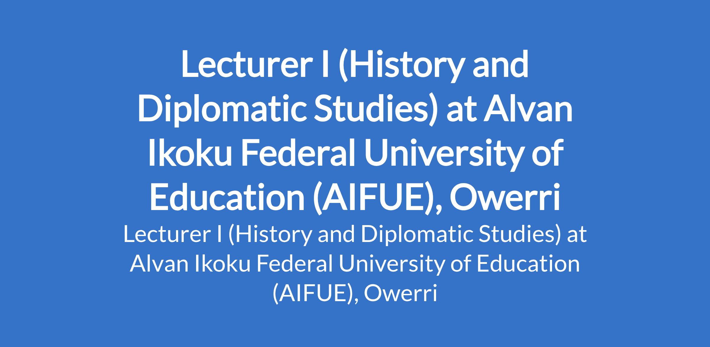 Alvan Ikoku Federal University of Education (AIFUE), Owerri invites applications from suitably qualified candidates for the position of: Lecturer I (History and Diplomatic Studies). The position is located in Imo State. Interested candidates should possess a Master's Degree in the relevant field with a minimum of 6 years of teaching and research experience, and not less than 3 years as a Lecturer II in a recognized university. A PhD in the relevant field shall be an advantage. Applicants must possess evidence of a teaching / research experience with scholary publications.