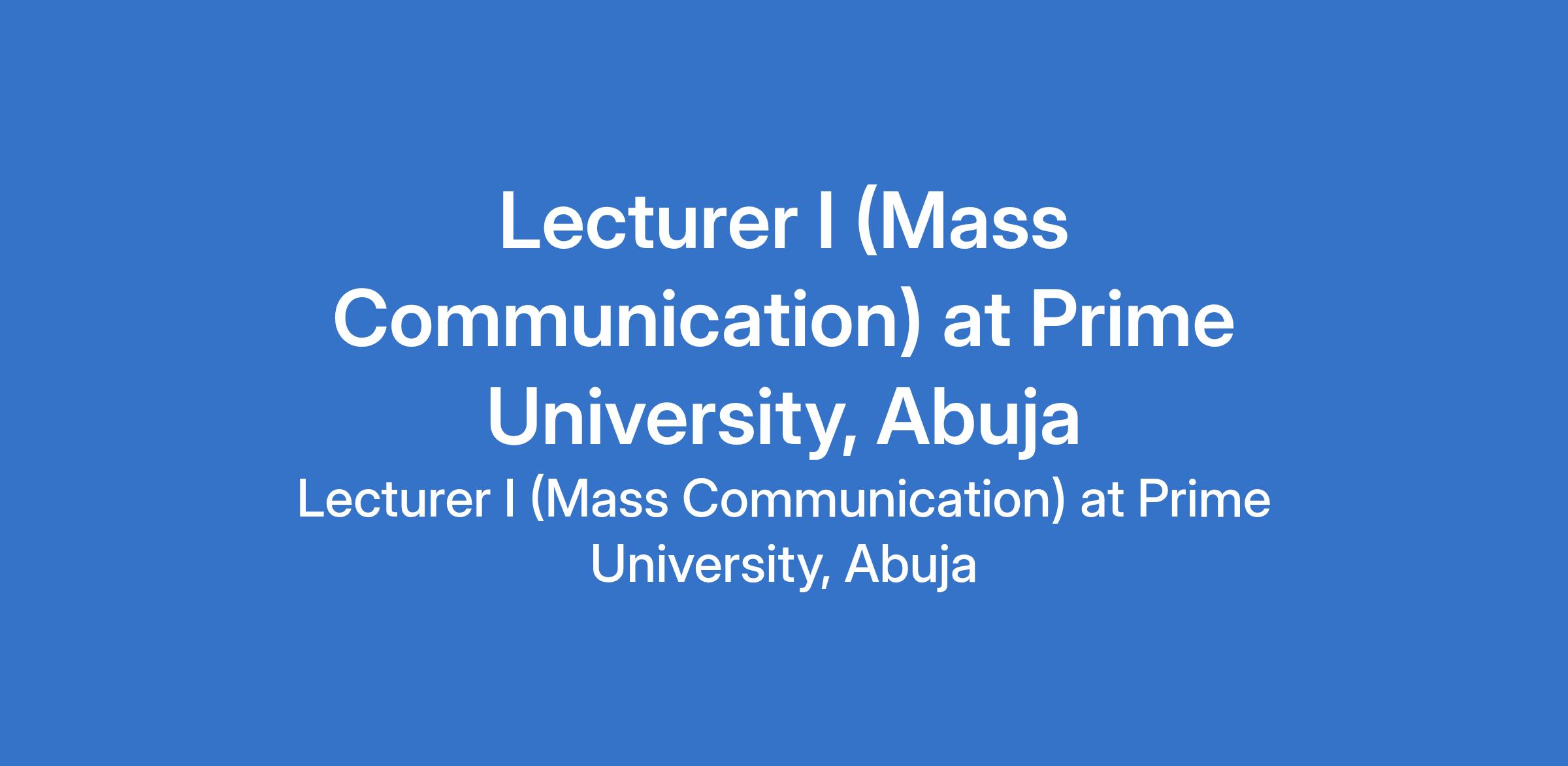 Prime University is recruiting to fill the position of: Lecturer I (Mass Communication). The position is located in Abuja (FCT). Interested candidates should possess a Ph.D. degree in Mass Communication or a closely related discipline from a recognized university Or a Masters degree in Mass Communication with evidence of significant progress toward a Ph.D with at least three (3) years teaching and research experience at the university level or equivalent.