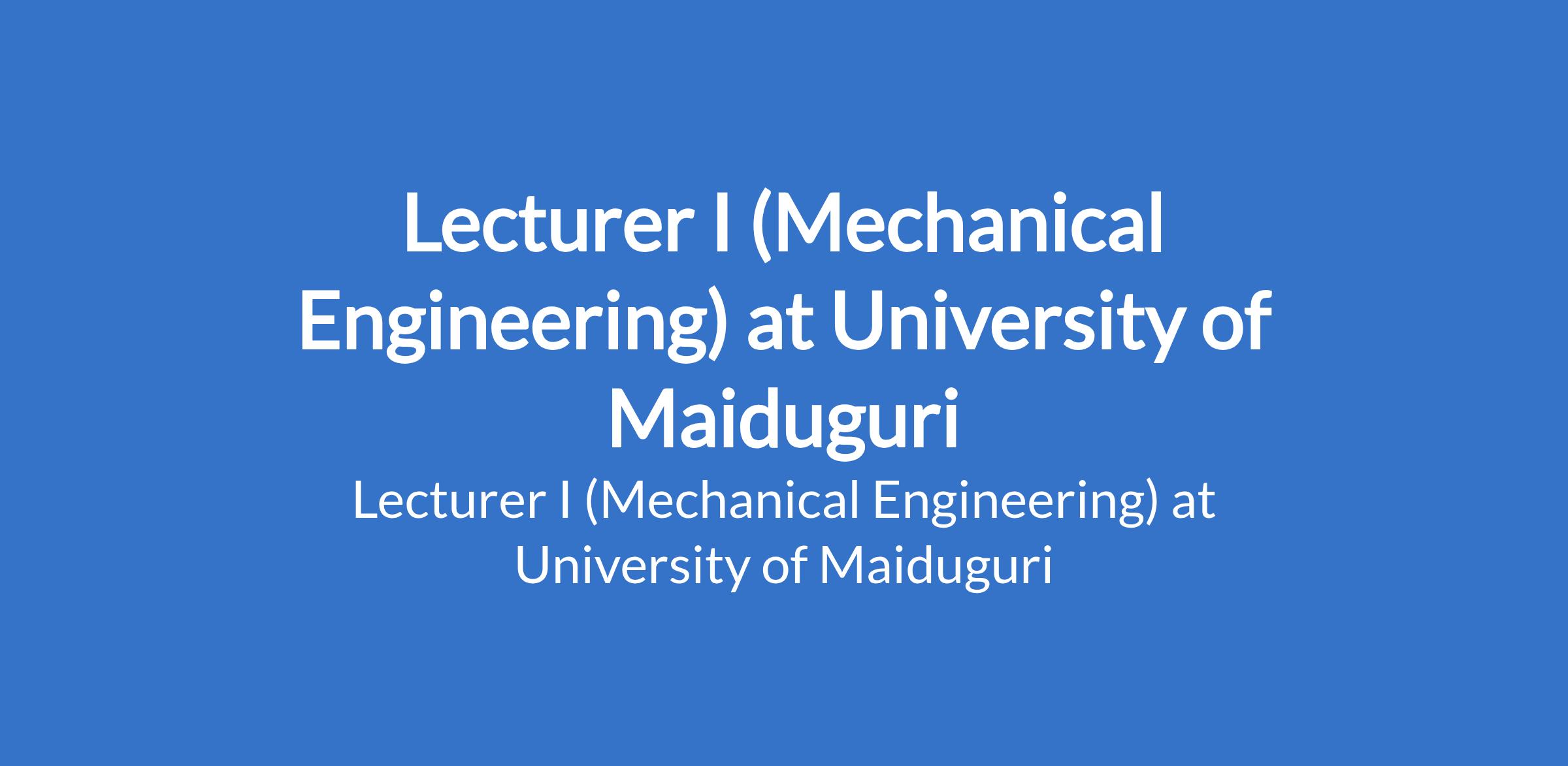 University of Maiduguri invites applications from suitable candidates to fill the position of: Lecturer I (Mechanical Engineering). The position is located in Borno State. Interested candidates should be a Master's Degree holder who has served as Lecturer II or equivalent for three years with a minimum of four years teaching experience and at least 16 admissible publication points, or recognised higher professional postgraduate fellowship where applicable.