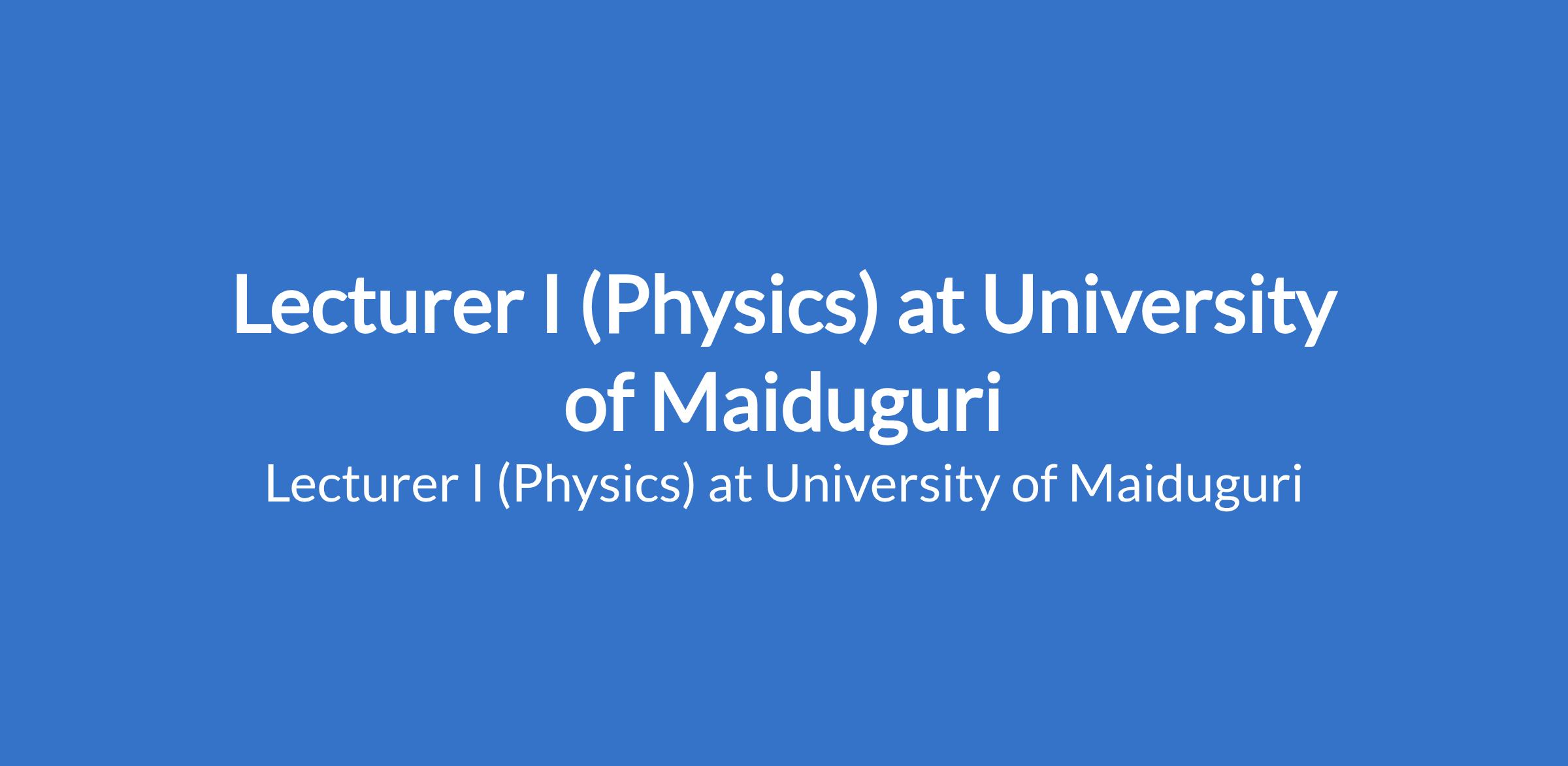 University of Maiduguri invites applications from suitable candidates to fill the position of: Lecturer I (Physics). The position is located in Borno State. Interested candidates should be a Master's Degree holder who has served as Lecturer II or equivalent for three years with a minimum of four years teaching experience and at least 16 admissible publication points, or recognised higher professional postgraduate fellowship where applicable.