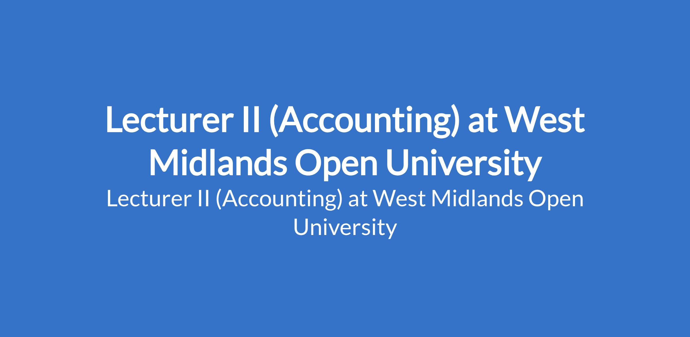 West Midlands Open University invites applications from suitable candidates to fill the position of: Lecturer II (Accounting). The position is located in Ikeja, Lagos State. Interested candidates should possess a Ph.D Degree or at least, 3 years of teaching experience as Assistant Lecturer in addition to at least 4 points from recognized publications.