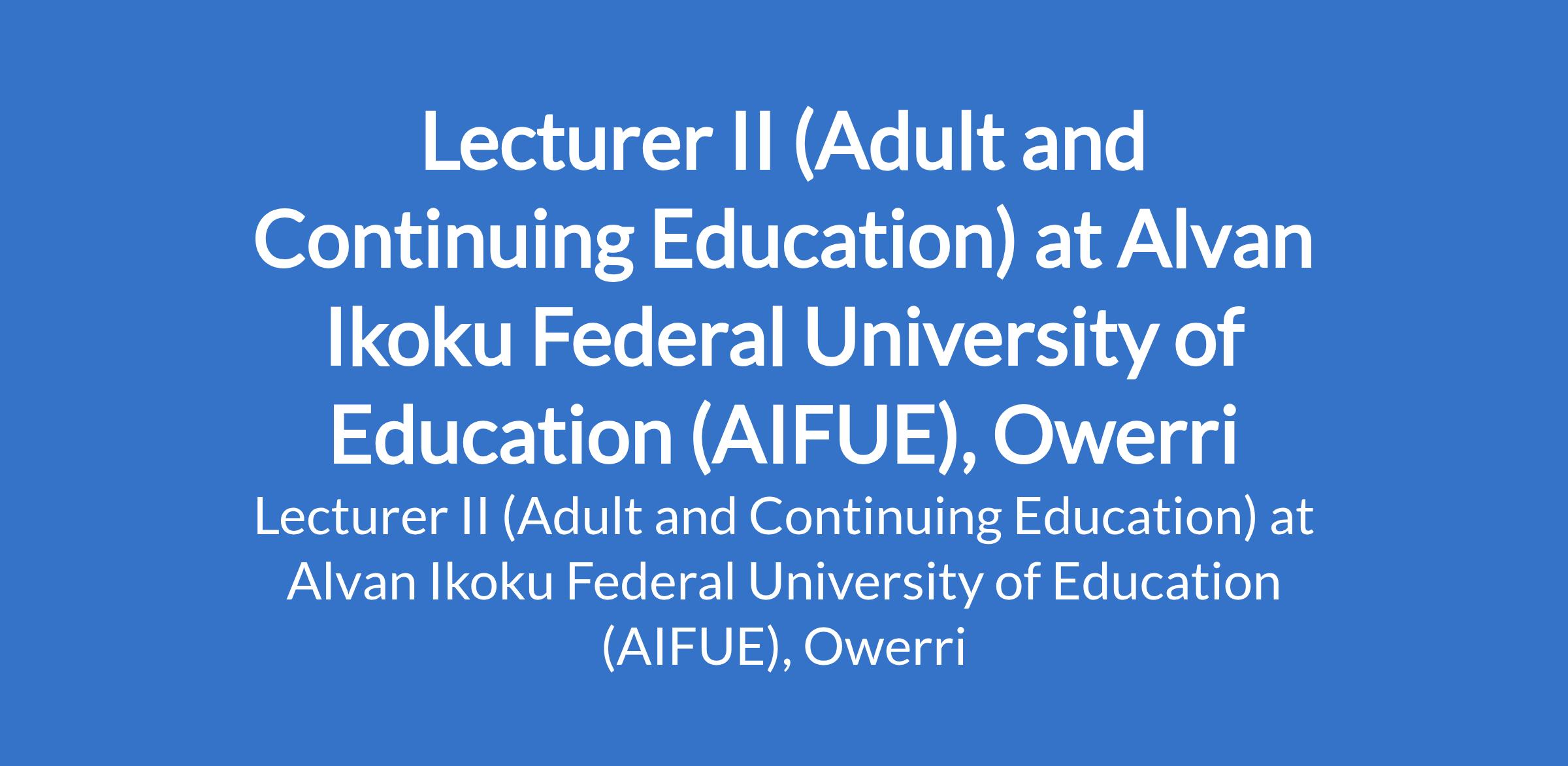Alvan Ikoku Federal University of Education (AIFUE), Owerri invites applications from suitably qualified candidates for the position of: Lecturer II (Adult and Continuing Education). The position is located in Imo State. Interested candidates should possess minimum of a Master's Degree in the relevant field with a minimum of three (3) years as an Assistant Lecturer in a recognized university or a PhD in the relevant field.
