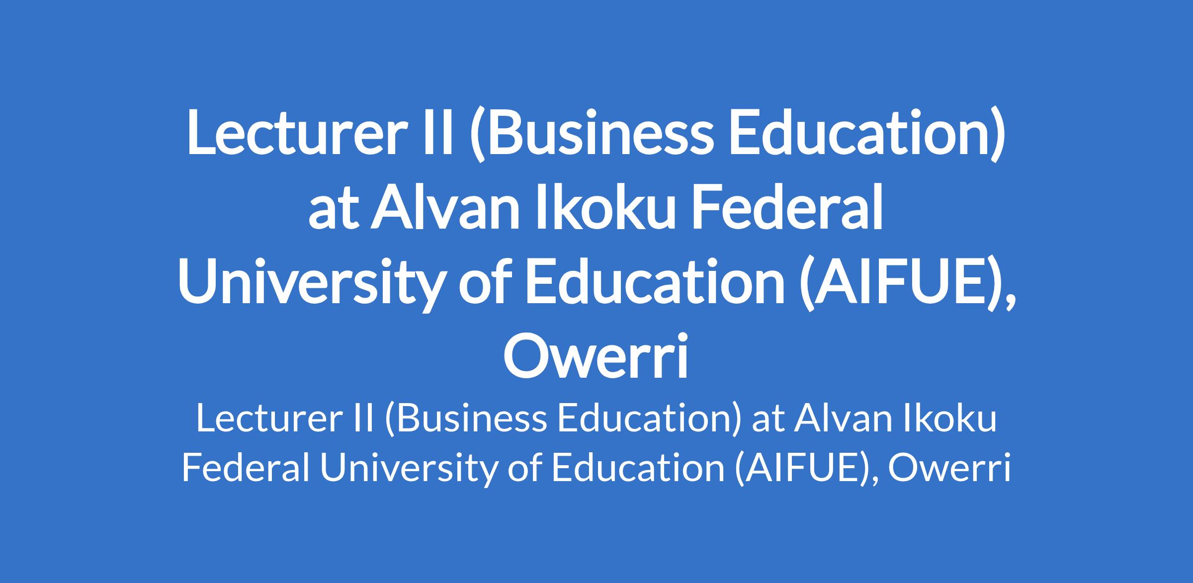Alvan Ikoku Federal University of Education (AIFUE), Owerri invites applications from suitably qualified candidates for the position of: Lecturer II (Business Education). The position is located in Imo State. Interested candidates should possess minimum of a Master's Degree in the relevant field with a minimum of three (3) years as an Assistant Lecturer in a recognized university or a PhD in the relevant field.