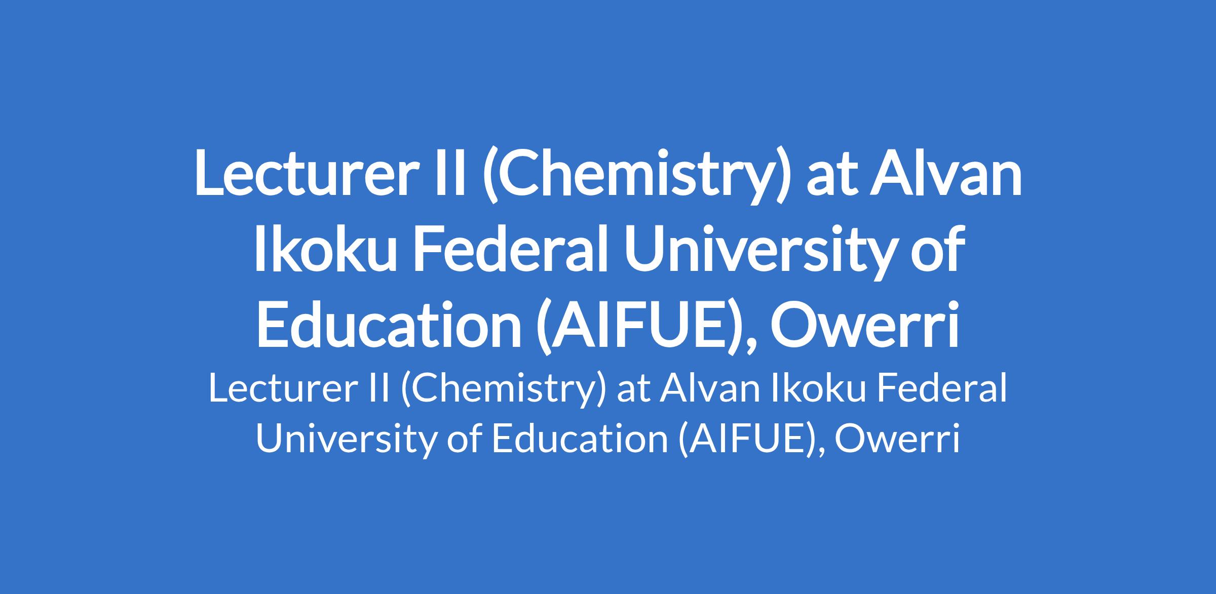 Alvan Ikoku Federal University of Education (AIFUE), Owerri invites applications from suitably qualified candidates for the position of: Lecturer II (Chemistry). The position is located in Imo State. Interested candidates should possess minimum of a Master's Degree in the relevant field with a minimum of three (3) years as an Assistant Lecturer in a recognized university or a PhD in the relevant field.