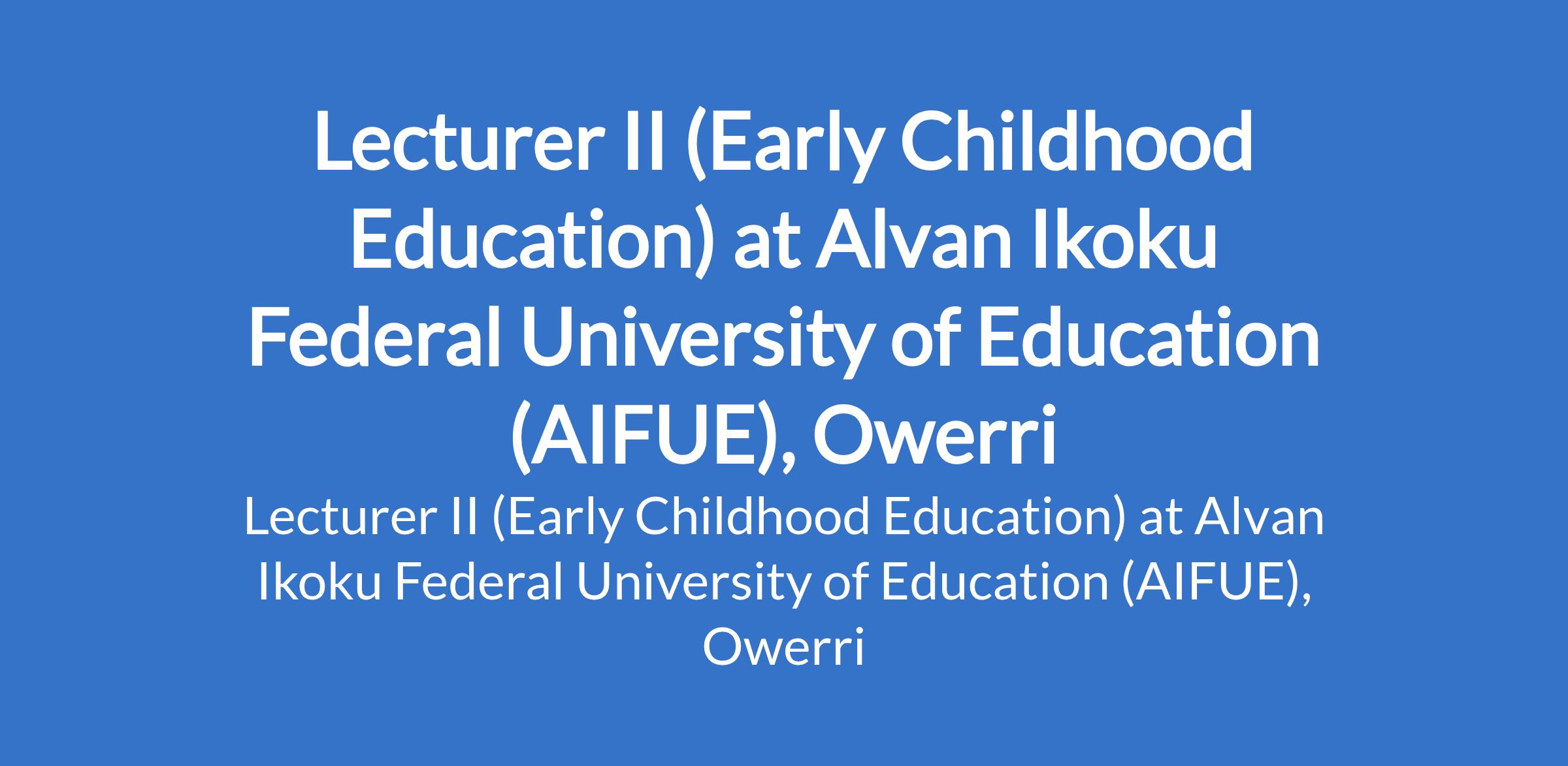 Alvan Ikoku Federal University of Education (AIFUE), Owerri invites applications from suitably qualified candidates for the position of: Lecturer II (Early Childhood Education). The position is located in Imo State. Interested candidates should possess minimum of a Master's Degree in the relevant field with a minimum of three (3) years as an Assistant Lecturer in a recognized university or a PhD in the relevant field.