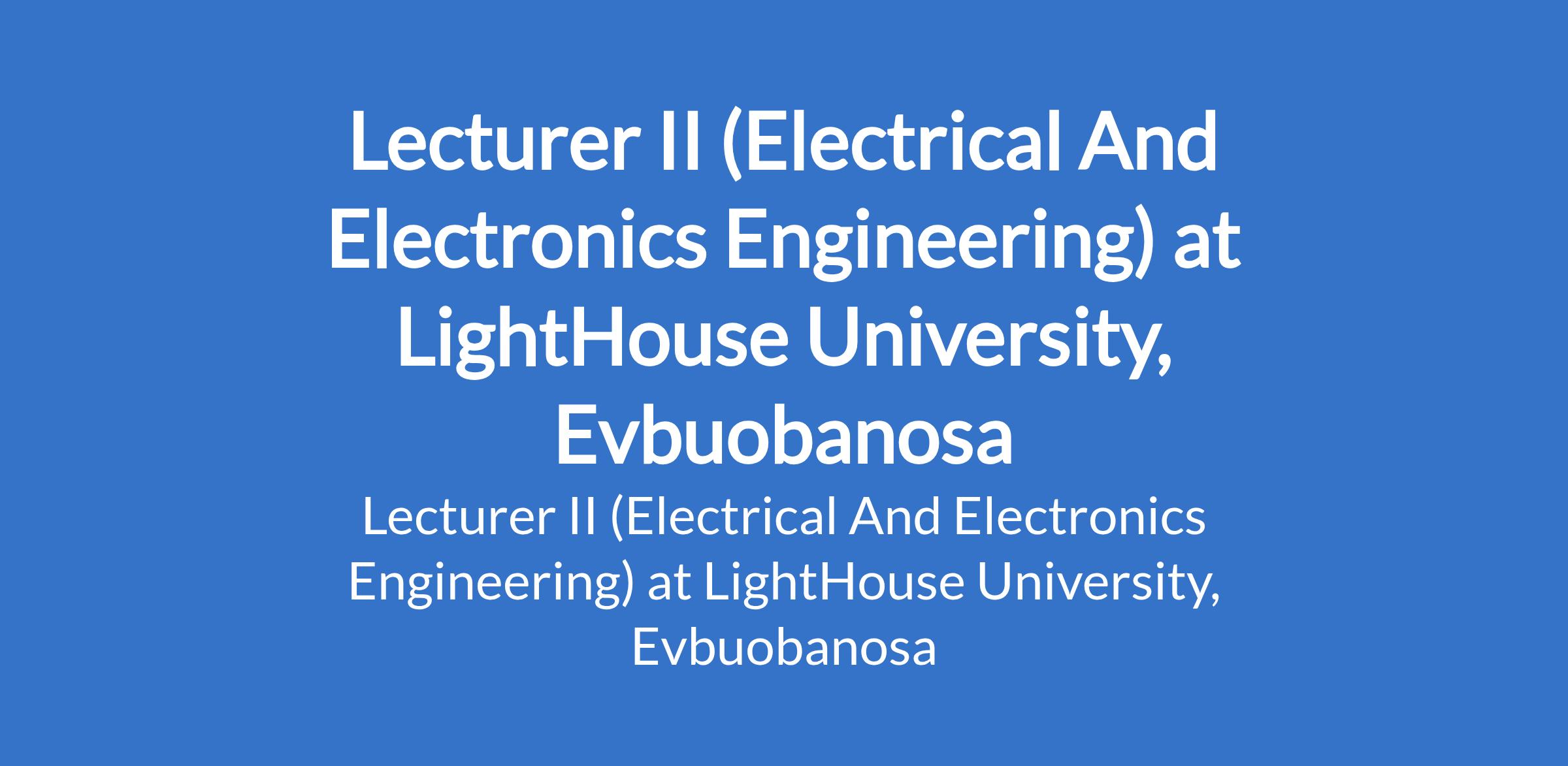 LightHouse University, Evbuobanosa invites applications from suitably qualified candidates to fill the position of: Lecturer II (Electrical And Electronics Engineering). The position is located in Edo State. Interested candidates should possess Candidates should possess a Ph.D Degree in relevant field or evidence of Ph.D defense required with experience.