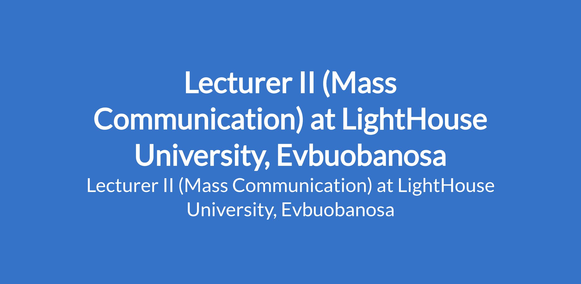 LightHouse University, Evbuobanosa invites applications from suitably qualified candidates to fill the position of: Lecturer II (Mass Communication). The position is located in Edo State. Interested candidates should possess Candidates should possess a Ph.D Degree in relevant field or evidence of Ph.D defense required with experience.