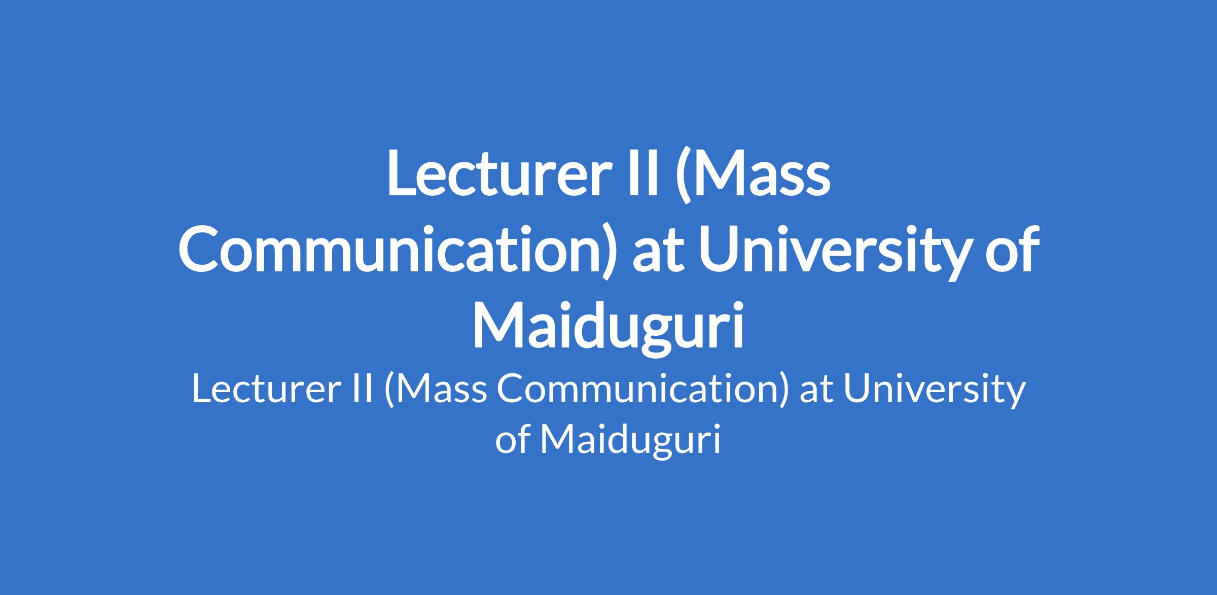 University of Maiduguri invites applications from suitable candidates to fill the position of: Lecturer II (Mass Communication). The position is located in Borno State. Interested candidates should possess a Master's Degree from University of Maiduguri or another recognised institution with at least three years post-qualification experience.
