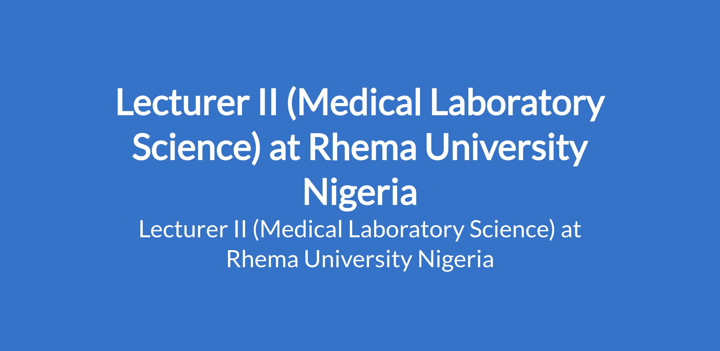 Rhema University Nigeria invites applications from suitably qualified candidates for the position of: Lecturer II (Medical Laboratory Science). The position is located in Aba, Abia State. Interested candidates should possess a Ph.D Degree with relevant experience.