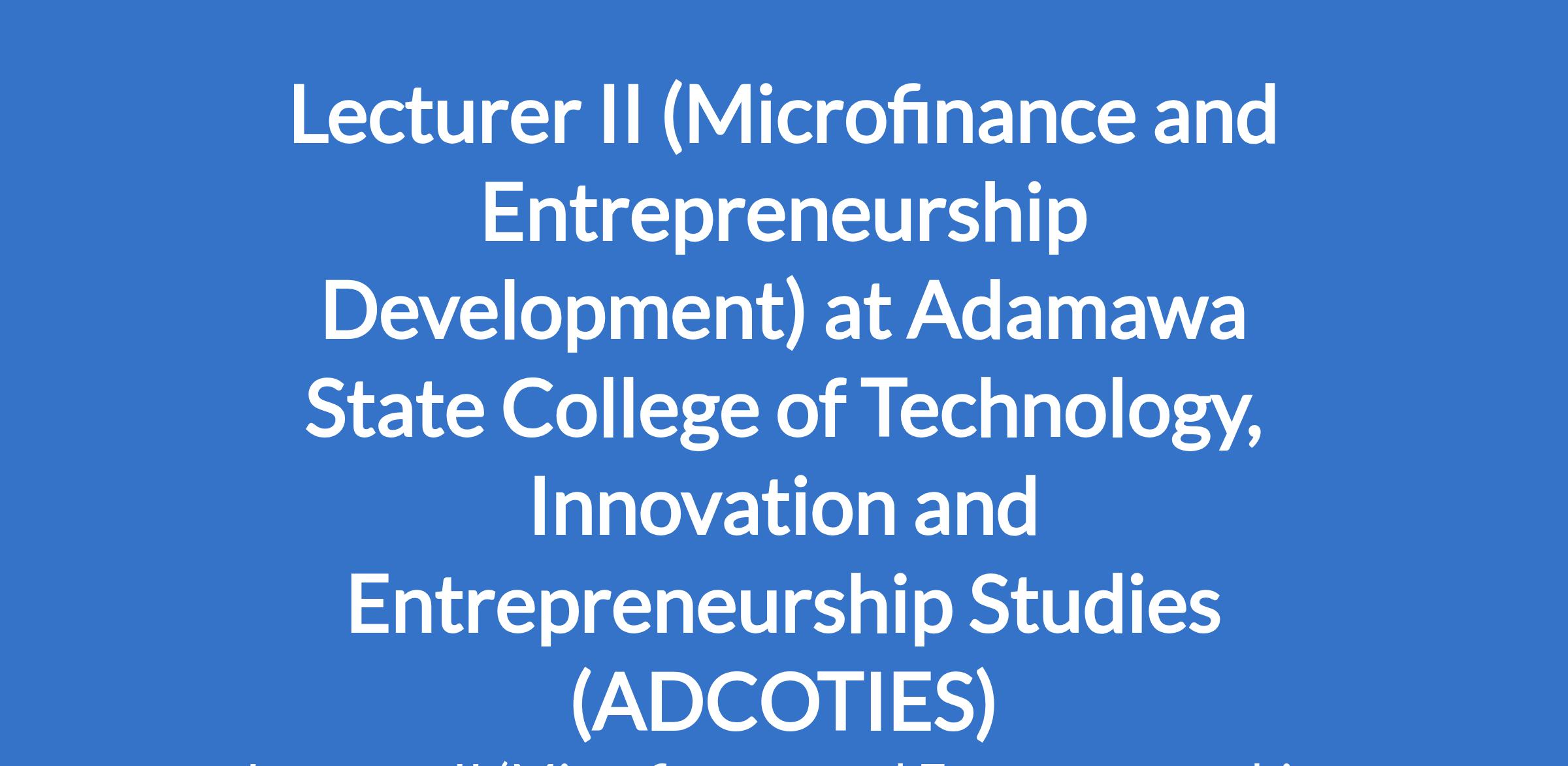 Adamawa State College of Technology, Innovation and Entrepreneurship Studies (ADCOTIES) is recruiting to fill the position of: Lecturer II (Microfinance and Entrepreneurship Development). The position is located in Gulak, Adamawa State. Interested candidates should possess a Master's Degree in Business Administration / Management, Entrepreneurship Studies, Economics, Finance, Microfinance, Enterprise Development, from a recognised institution plus at least 6 years of teaching / research, or industrial work experience, or a PhD in the relevant discipline above, from a recognised institution.