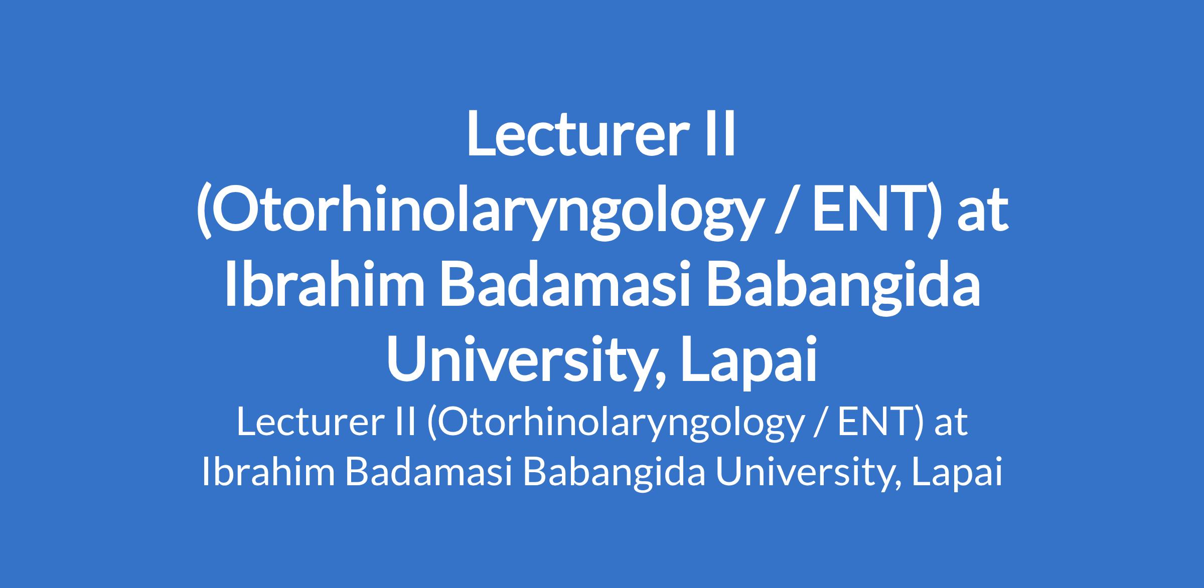 Ibrahim Badamasi Babangida University, Lapai invites applications from suitably qualified candidates to fill the position of: Lecturer II (Otorhinolaryngology / ENT). The position is located in Niger State. Interested candidates must possess an M.B.B.S Degree from a recognized University plus professional registration with Medical and Dental Council of Nigeria (MDCN) and NYSC certificate/exemption certificate.