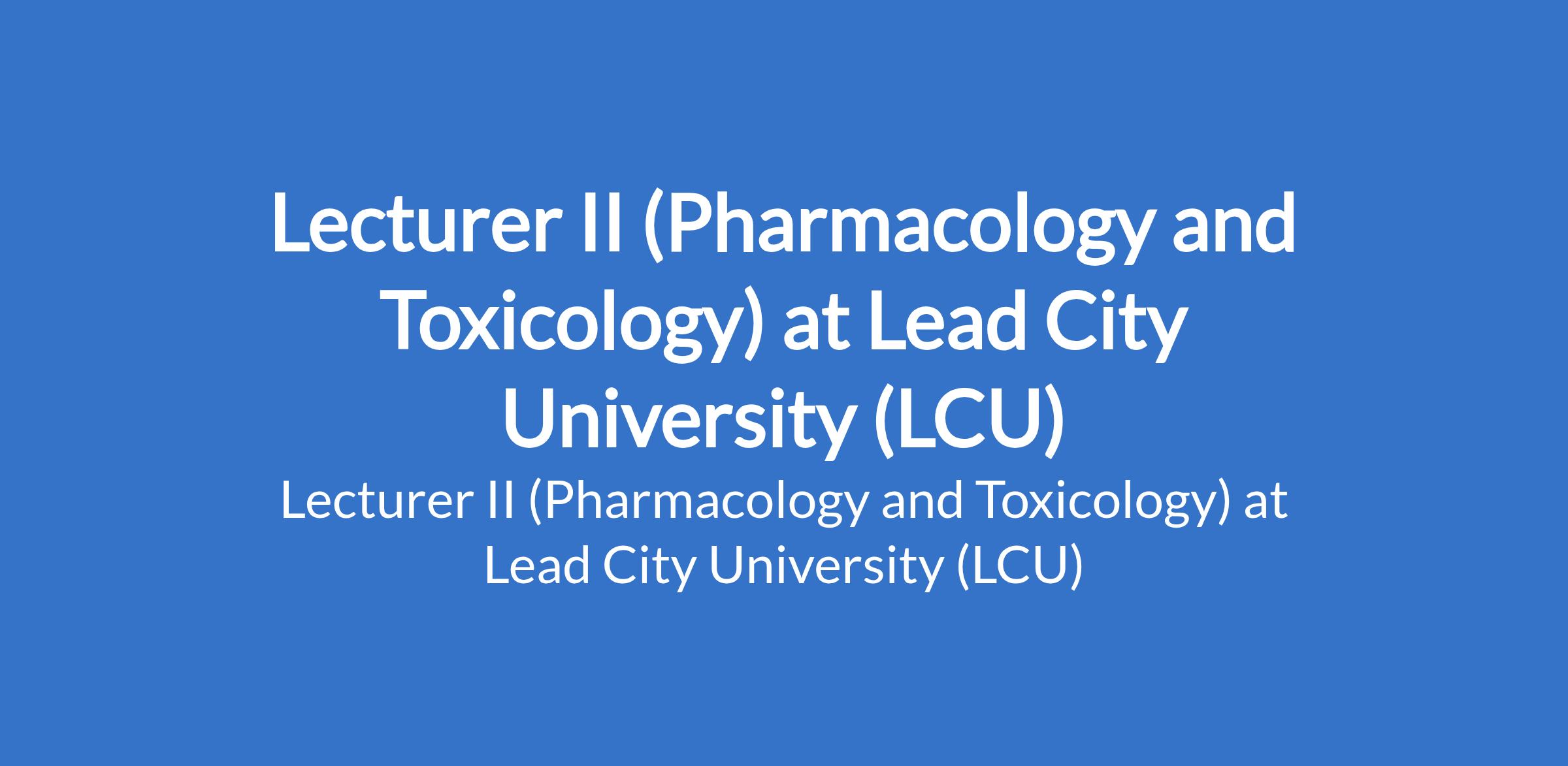 Lead City University (LCU) invites applications from suitable candidates to fill the position of: Lecturer II (Pharmacology and Toxicology). The position is located in Ibadan, Oyo State. Interested candidates should possess a good First Degree, not below second class lower division, from a reputable University and a PhD Degree in the appropriate discipline, a Master's Degree plus a recognised professional certificate / licence in the appropriate discipline will also be considered.
